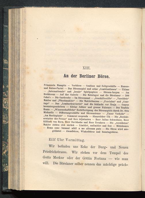 — „Internationale“ und „locale“ Spielpapiere — Börsen-Jargon — AmDrehkreuz — Auf der Oalcrie — Die Meininger und die Börsianer — 500Cohn's — Die Garderobe — Im Börsensaal — „Geschäftsstille“ — „Vereidete“Makler und „Pfuschmakler“ — Die Maklerbarren — „Provision“ und „Cour-tage“ — Das „Lombardenviertel“ und die Schlacht vor Troja — Courseheruntergeschrieen — Kleine Jobber und grosse Faiseurs — Des TeufelsErnte — „Wissenschaftliche “ Rechtfertigung des Börsenspiels durch Dr. OttoMichaelis — Differenzgeschäfte und Börsenstener — „Unser Verkehr“ —„Am Moritzplatz“ — Comment suspcndu — Sinnreicher Ulk — Die „Bericht-erstatter der Presse“ und ihre Adjutanten — Herr Julius Schweitzer, HerrKillisch von Horn , Herr Davidsohn und Herr Treuherz — Die „vereideten“Makler ziehen sich zurück — Limitirt, unlimitirt und fest — Mittelcours