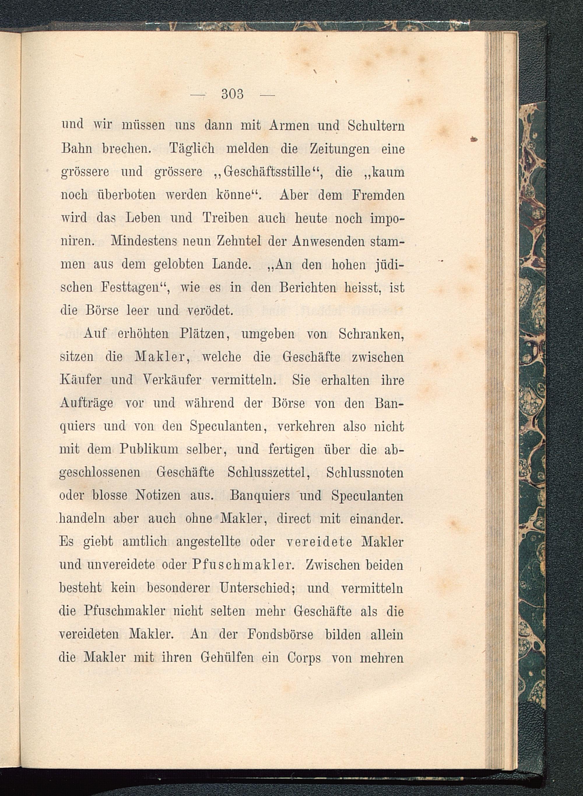 und wir müssen uns dann mit Armen und SchulternBahn brechen. Täglich melden die Zeitungen einegrössere und grössere „Geschäftsstille“, die „kaumnoch überboten werden könne“. Aber dem Fremdenwird das Leben und Treiben auch heute noch impo-niren. Mindestens neun Zehntel der Anwesenden stam-men aus dem gelobten Lande. „An den hohen jüdi-schen Festtagen“, wie es in den Berichten heisst, istdie Börse leer und verödet.