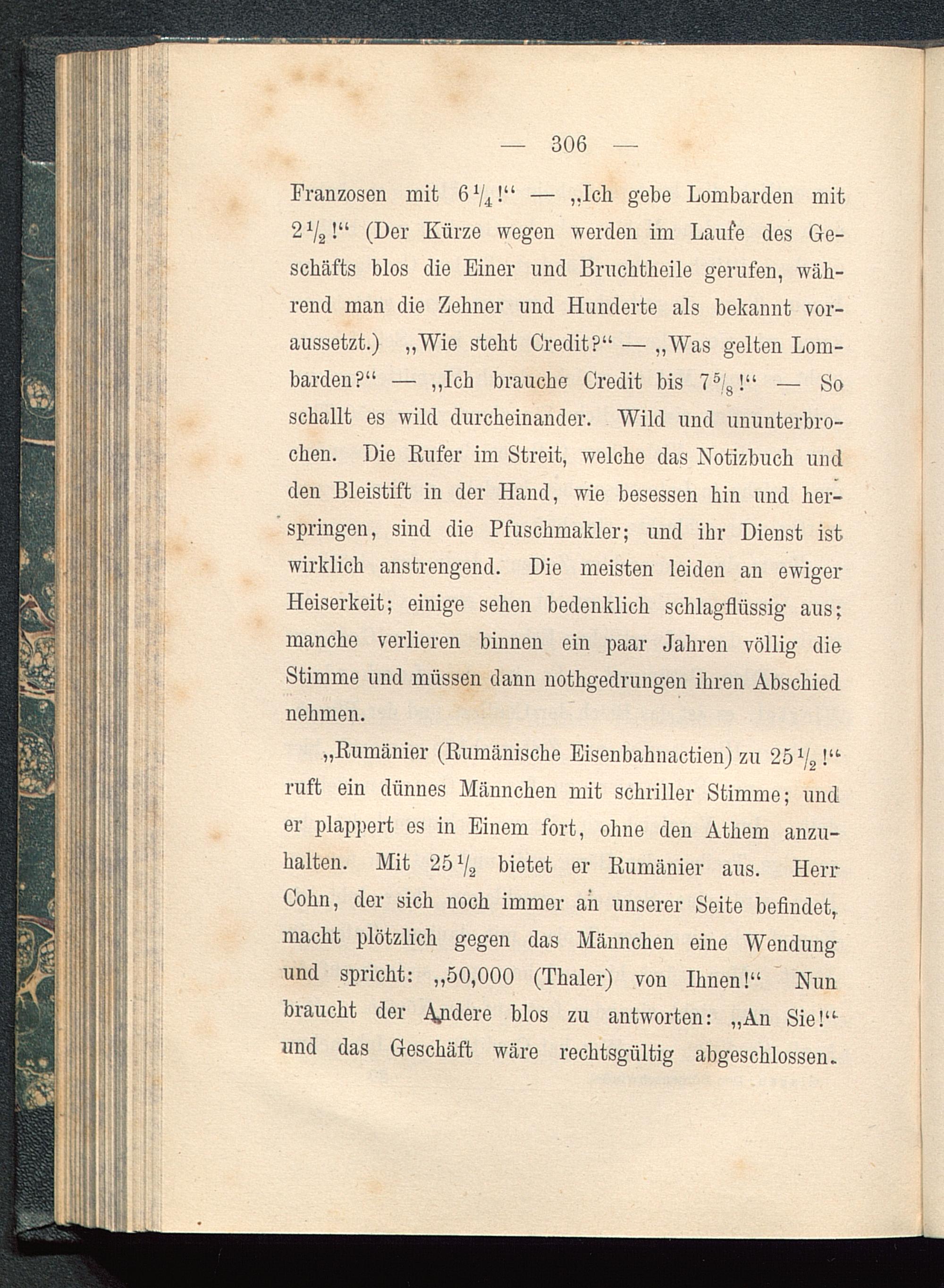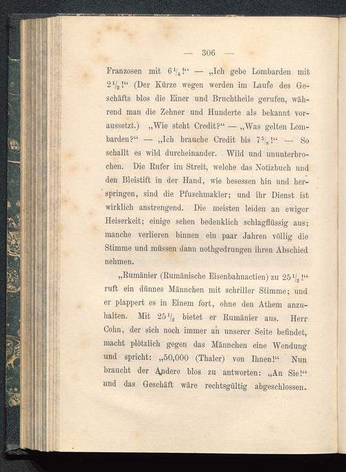 Cohn, der sich noch immer an unserer Seite befindet,macht plötzlich gegen das Männchen eine Wendungund spricht: „50,000 (Thaler) von Ihnen!“ Nunbraucht der Andere pi os zu antworten: „An Sie!“und das Geschäft wäre rechtsgültig abgeschlossen.