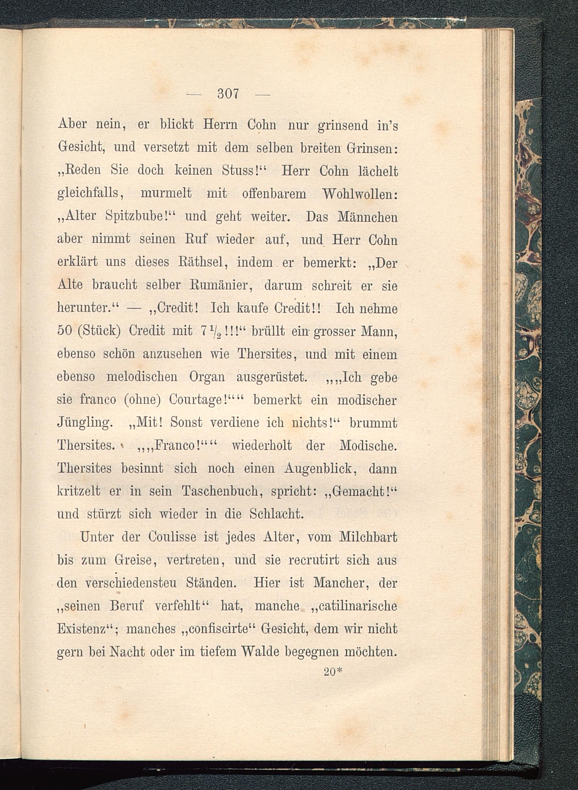 Aber nein, er blickt Herrn Cohn nur grinsend in’sGesiebt, und versetzt mit dem selben breiten Grinsen:„Reden Sie doch keinen Stuss!“ Herr Cohn lächeltgleichfalls, murmelt mit offenbarem Wohlwollen:„Alter Spitzbube!“ und geht weiter. Das Männchenaber nimmt seinen Ruf wieder auf, und Herr Cohnerklärt uns dieses Räthsel, indem er bemerkt: „DerAlte braucht selber Rumänier, darum schreit er sieherunter.“ — „Credit! Ich kaufe Credit !! Ich nehme50 (Stück) Credit mit 7 V 2 !!!“ brüllt ein grosser Mann,ebenso schön anzusehen wie Thersites, und mit einemebenso melodischen Organ ausgerüstet. „„Ich gebesie franco (ohne) Courtage!““ bemerkt ein modischerJüngling. „Mit! Sonst verdiene ich nichts!“ brummtThersites. ' „„Franco!““ wiederholt der Modische.Thersites besinnt sich noch einen Augenblick, dannkritzelt er in sein Taschenbuch, spricht: „Gemacht!“und stürzt sich wieder in die Schlacht.