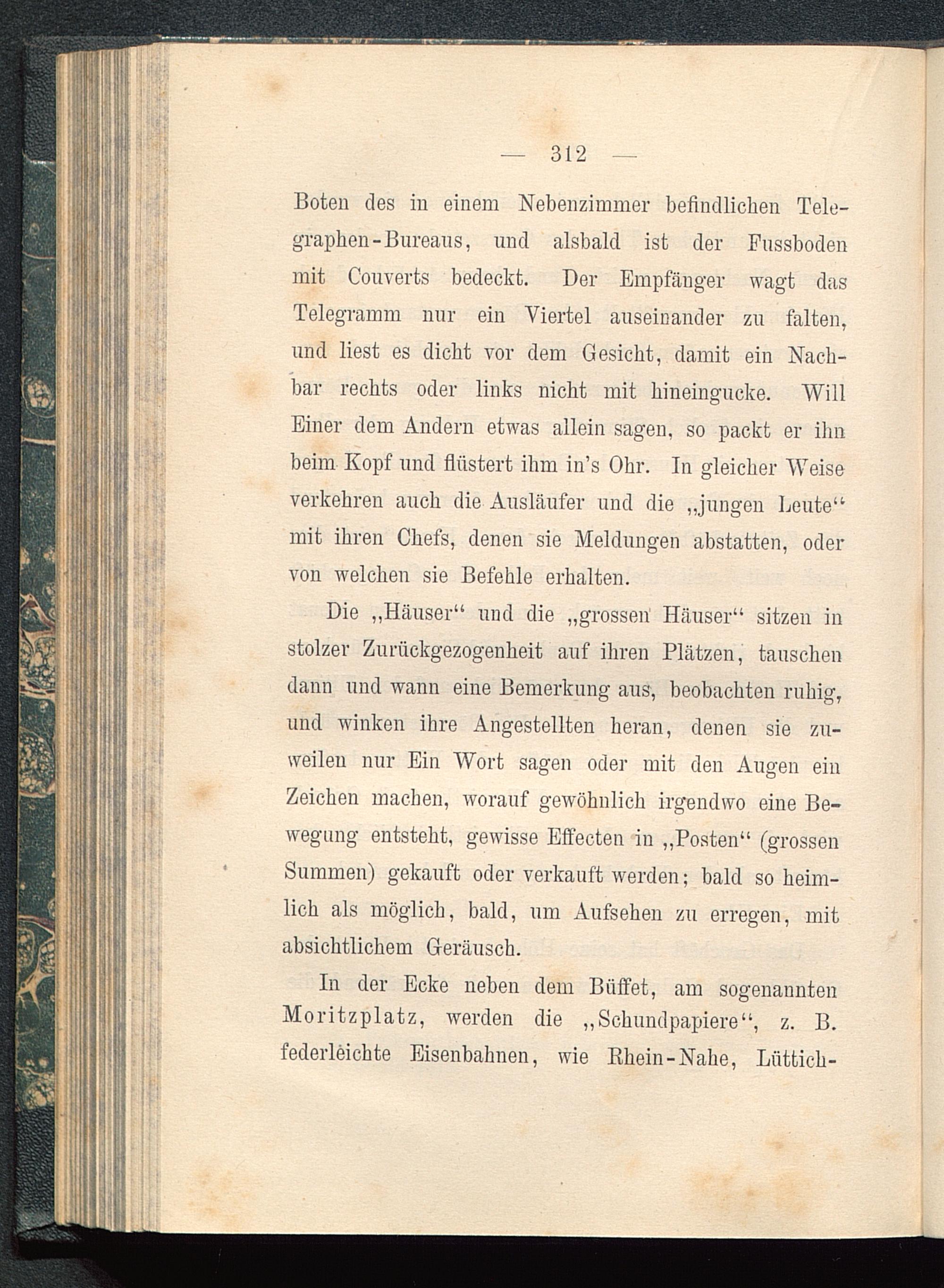 In der Ecke neben dem Büffet, am sogenanntenMoritzplatz, werden die „Schundpapiere“, z. B.federleichte Eisenbahnen, wie Bhein-Nahe, Lüttich -