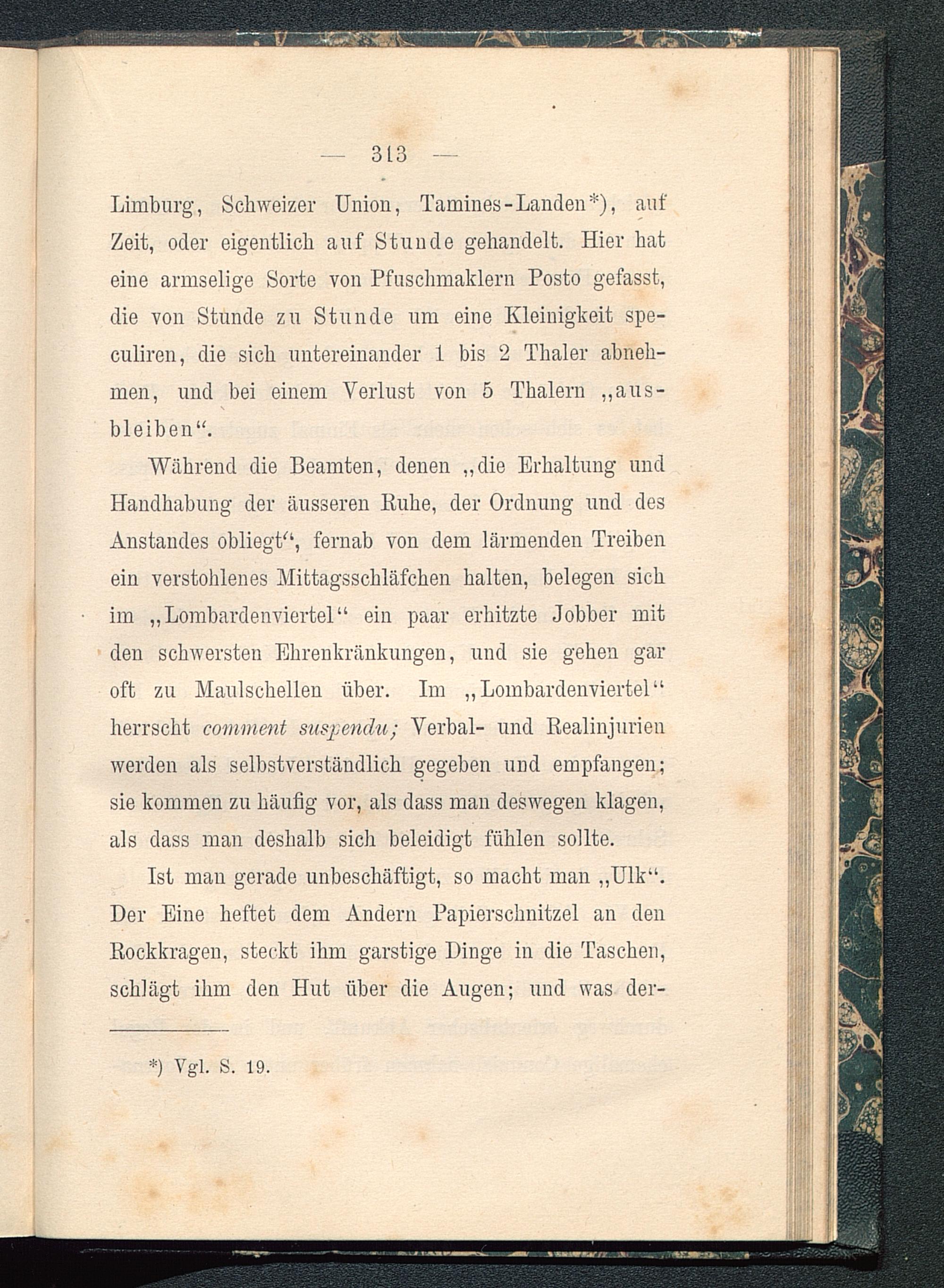 Während die Beamten, denen „die Erhaltung undHandhabung der äusseren Hube, der Ordnung und desAnstandes obliegt“, fernab von dem lärmenden Treibenein verstohlenes Mittagsschläfchen halten, belegen sichim „Lombardenviertel“ ein paar erhitzte Jobber mitden schwersten Ehrenkränkungen, und sie gehen garoft zu Maulschellen über. Im „Lombardenviertel“herrscht comment susjjendu; Verbal- und Realinjurienwerden als selbstverständlich gegeben und empfangen;sie kommen zu häufig vor, als dass man deswegen klagen,als dass man deshalb sich beleidigt fühlen sollte.
