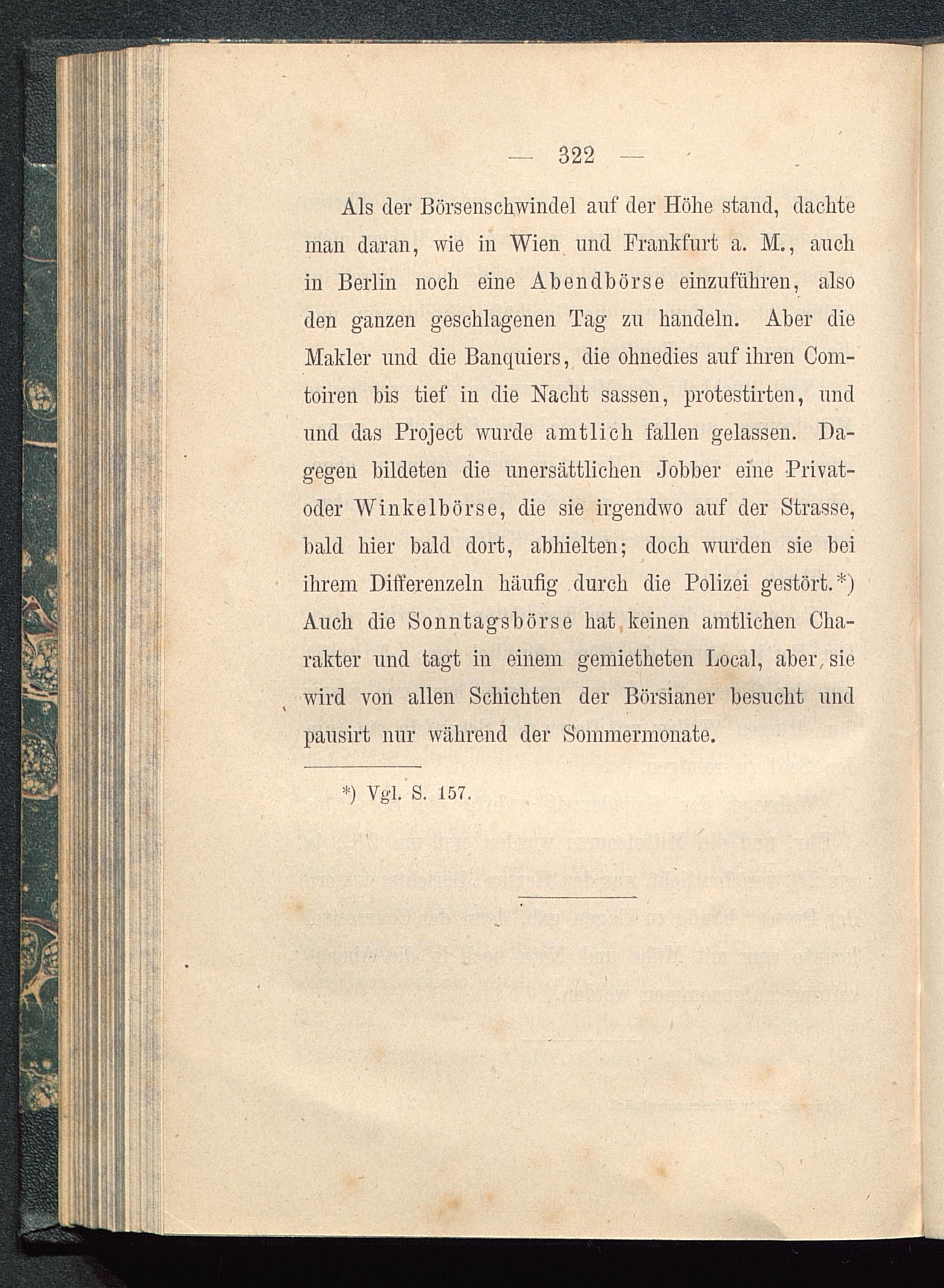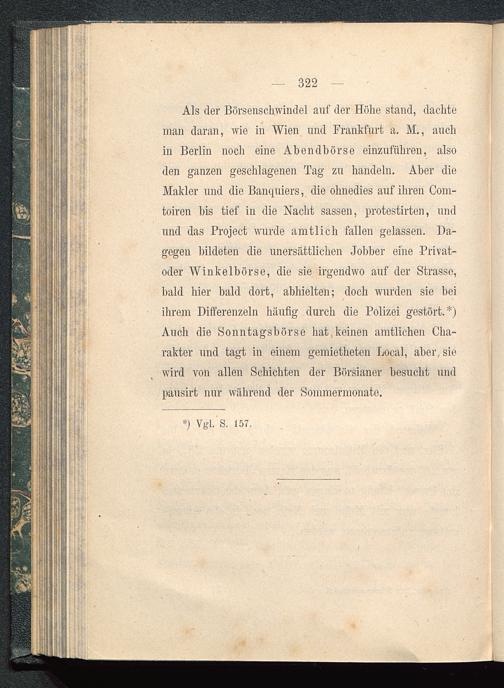 Als der Börsenschwindel auf der Höhe stand, dachteman daran, wie in Wien und Frankfurt a. M., auchin Berlin noch eine Abendbörse einzuführen, alsoden ganzen geschlagenen Tag zu handeln. Aber dieMakler und die Banquiers, die ohnedies auf ihren Com-toiren bis tief in die Nacht sassen, protestirten, undund das Project wurde amtlich fallen gelassen. Da-gegen bildeten die unersättlichen Jobber eine Privat-oder Winkelbörse, die sie irgendwo auf der Strasse,bald hier bald dort, abhielten; doch wurden sie beiihrem Differenzein häufig durch die Polizei gestört.*)Auch die Sonntagsbörse hat keinen amtlichen Cha-rakter und tagt in einem gemietheten Local, aber, siewird von allen Schichten der Börsianer besucht undpausirt nur während der Sommermonate.