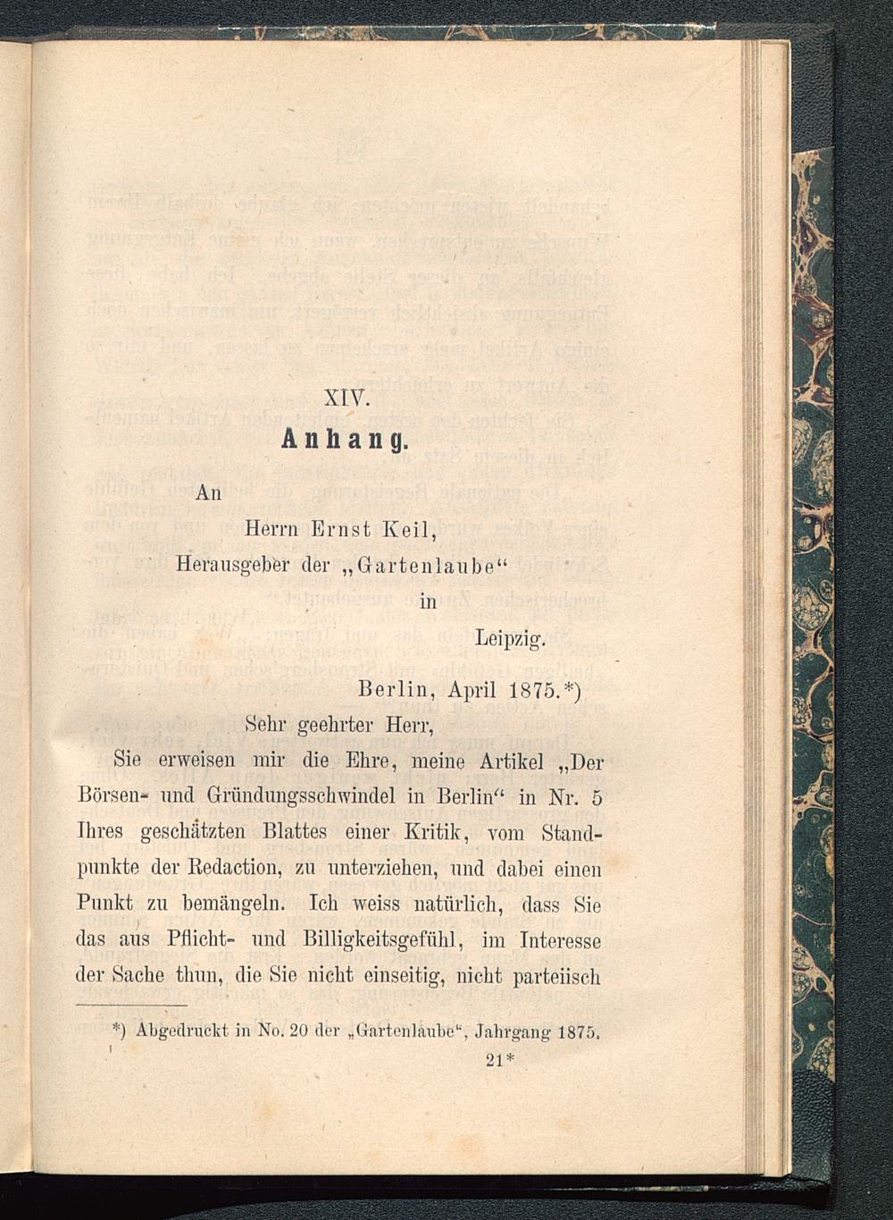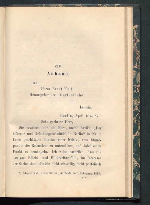 Sie erweisen mir die Ehre, meine Artikel „DerBörsen- und Gründungsschwindel in Berlin“ in Nr. 5Ihres geschätzten Blattes einer Kritik, vom Stand-punkte der Iledaction, zu unterziehen, und dabei einenPunkt zu bemängeln. Ich weiss natürlich, dass Siedas aus Pflicht- und Billigkeitsgefühl, im Interesseder Sache tlmn, die Sie nicht einseitig, nicht parteiisch