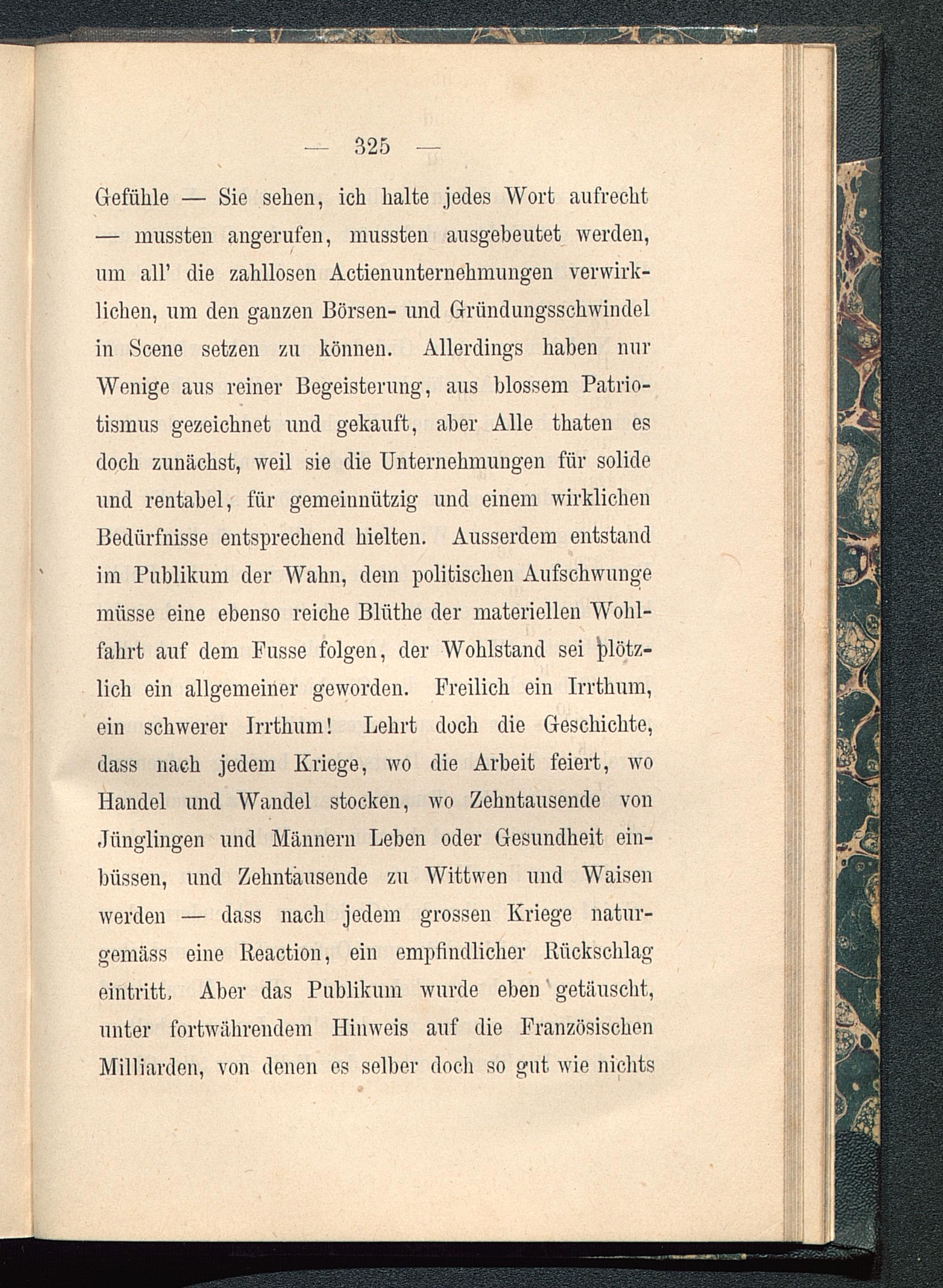 Gefühle — Sie sehen, ich halte jedes Wort aufrecht— mussten angerufen, mussten ausgebeutet werden,um all’ die zahllosen Actienunternehmungen verwirk-lichen, um den ganzen Börsen- und Gründungsschwindelin Scene setzen zu können. Allerdings haben nurWenige aus reiner Begeisterung, aus blossem Patrio-tismus gezeichnet und gekauft, aber Alle thaten esdoch zunächst, weil sie die Unternehmungen für solideund rentabel, für gemeinnützig und einem wirklichenBedürfnisse entsprechend hielten. Ausserdem entstandim Publikum der Wahn, dem politischen Aufschwüngemüsse eine ebenso reiche Blüthe der materiellen Wohl-fahrt auf dem Busse folgen, der Wohlstand sei plötz-lich ein allgemeiner geworden. Freilich ein Irrthum,ein schwerer Irrthum! Lehrt doch die Geschichte,dass nach jedem Kriege, wo die Arbeit feiert, woHandel und Wandel stocken, wo Zehntausende vonJünglingen und Männern Leben oder Gesundheit ein-biissen, und Zehntäusende zu Wittwen und Waisenwerden — dass nach jedem grossen Kriege natur-gemäss eine Reaction, ein empfindlicher Rückschlageintritt. Aber das Publikum wurde eben' getäuscht,unter fortwährendem Hinweis auf die Französischen Milliarden, von denen es selber doch so gut wie nichts