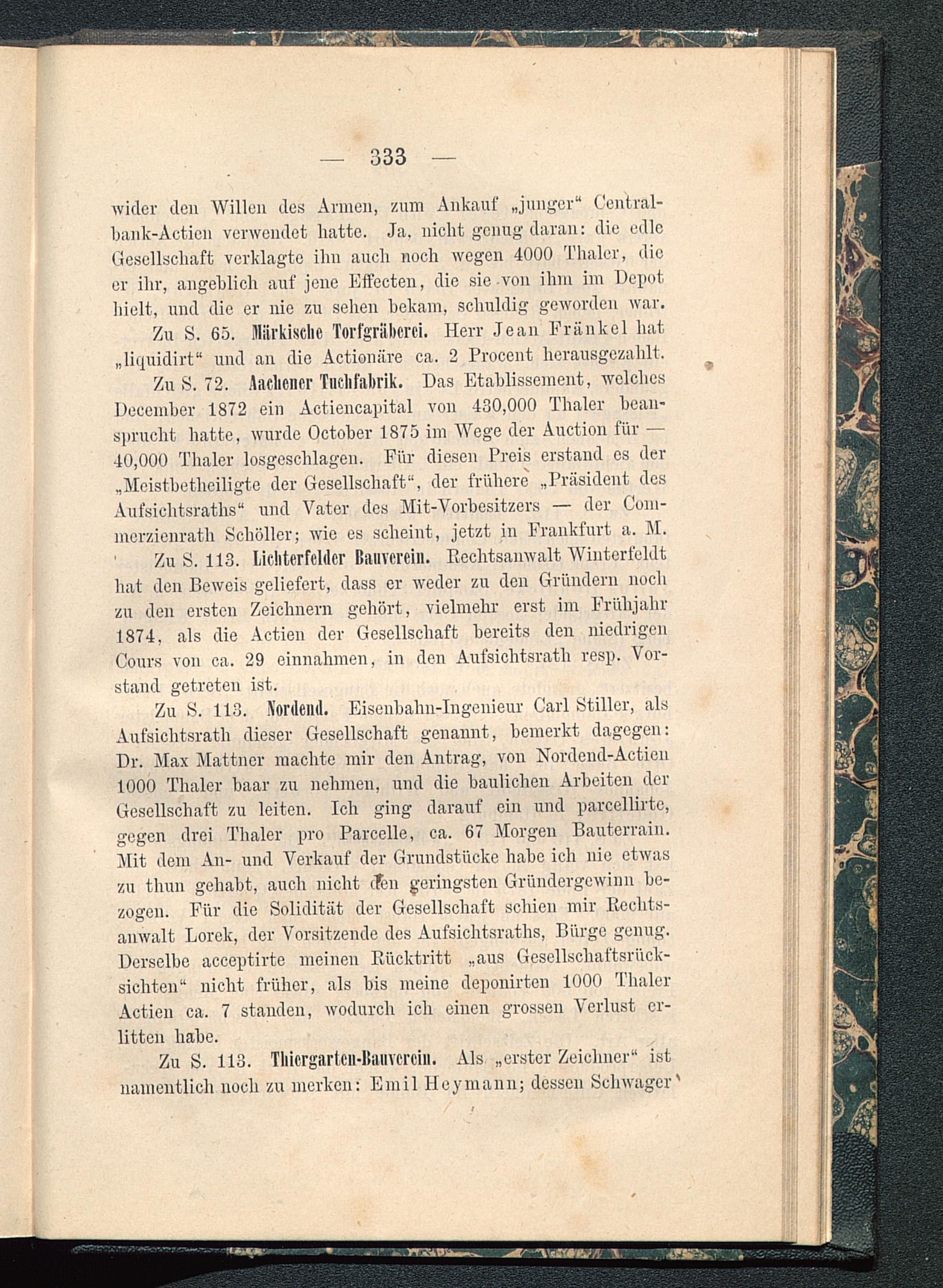 Zu fc>. 113. Nordend. Eisenbahn -Ingenieur Carl Stiller, alsAufsichtsrath dieser Gesellschaft genannt, bemerkt dagegen:Dr. Max Mattner machte mir den Antrag, von Nordcnd-Acticn1000 Thaler haar zu nehmen, und die baulichen Arbeiten derGesellschaft zu leiten. Ich ging darauf ein und parcellirtc,gegen drei Thaler pro Parcclle, ca. 67 Morgen Bauterrain.Mit dem An- und Verkauf der Grundstücke habe ich nie etwaszu tlmn gehabt, auch nicht (Ten geringsten Gründergewinn be-zogen. Für die Solidität der Gesellschaft schien mir Rechts-anwalt Lorek, der Vorsitzende des Aufsichtsraths, Bürge genug.Derselbe acceptirtc meinen Rücktritt „aus Gesellschaftsrück-sichten“ nicht früher, als bis meine deponirten 1000 ThalerActien ca. 7 standen, wodurch ich einen grossen Verlust er-litten habe.