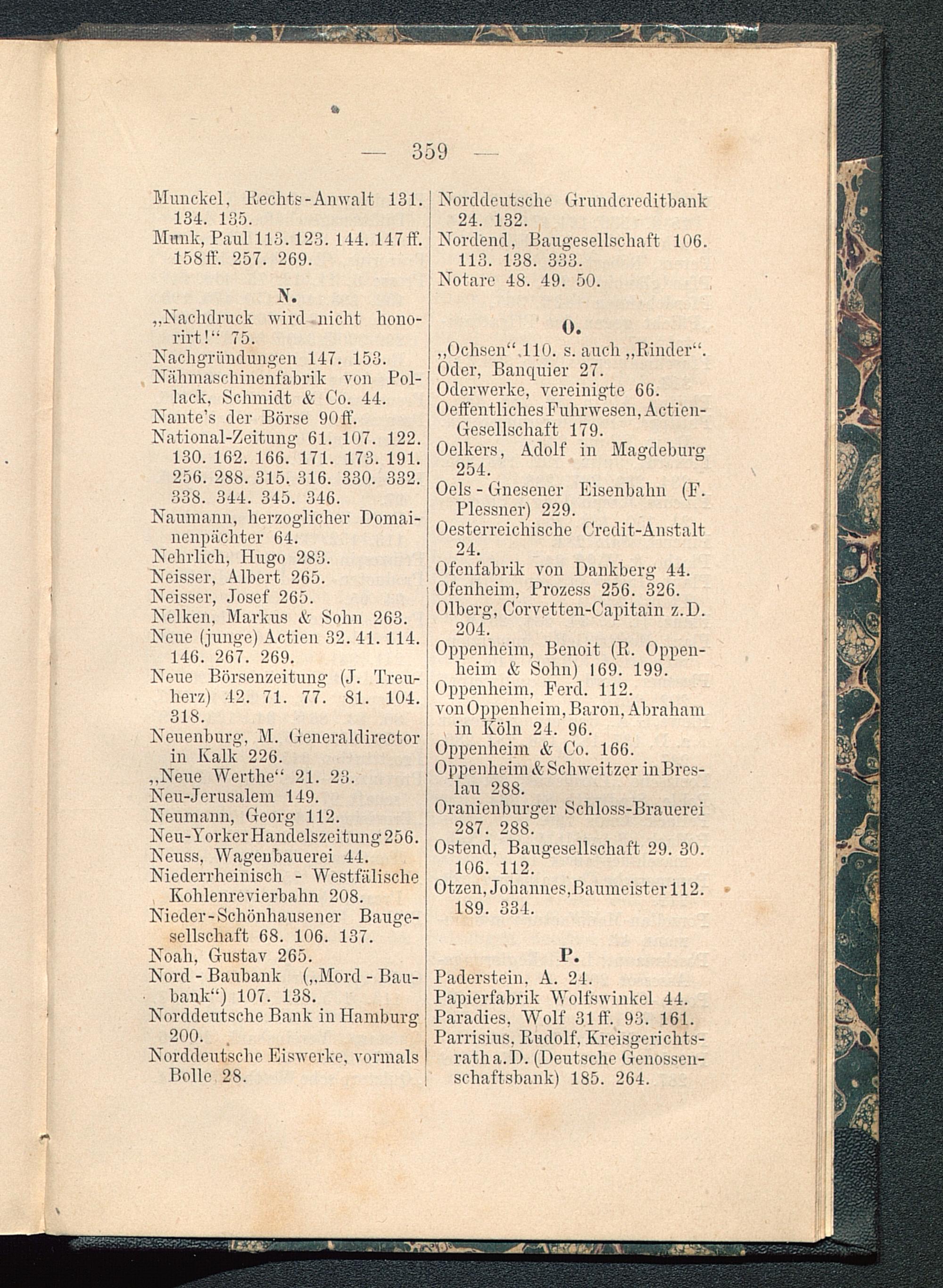 Nachgründungen 147. 153.Niihmasohinenfabrik von Pol-lack. Schmidt & Co. 44.Nante’s der Börse 90 ff.National-Zeitung 61. 107. 122.130. 162. 166. 171. 173. 191.256. 288. 315. 316. 330. 332.338. 344. 345. 346.Naumann, herzoglicher Domai-nenpächter 64.
