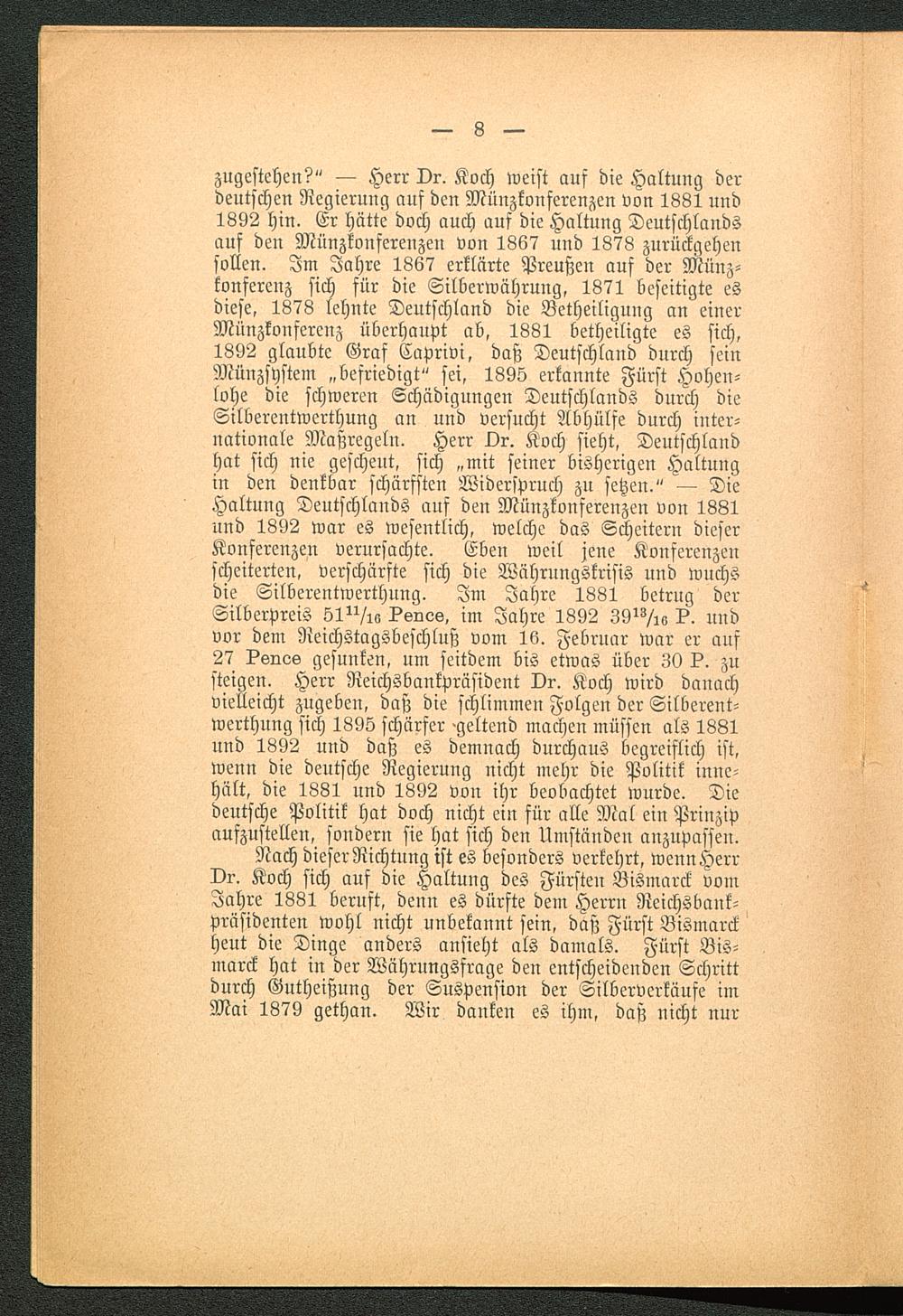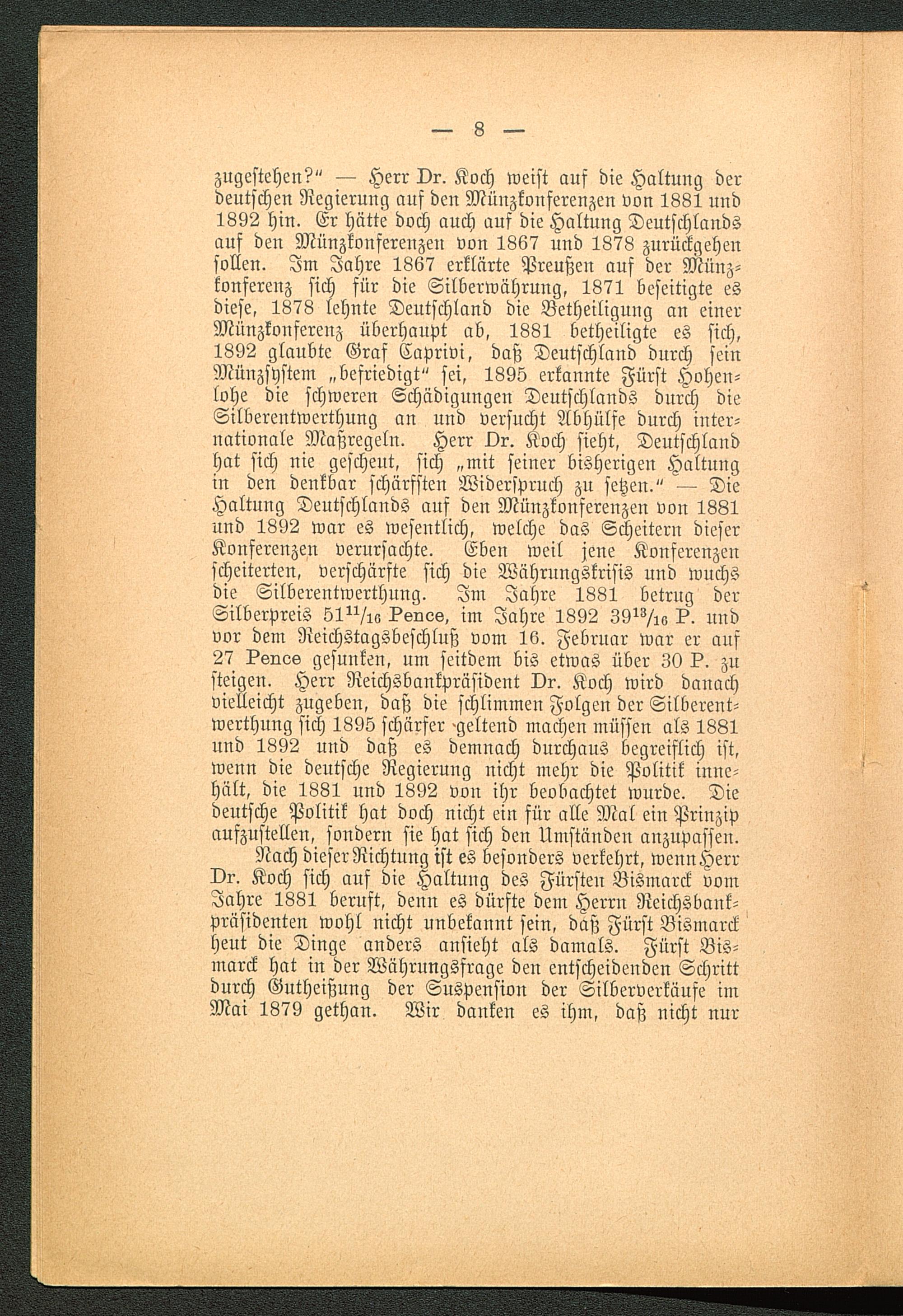 Nach dieser Richtung ist es besonders verkehrt, wenn HerrDr. Koch sich auf die Haltung des Fürsten Bismarck vomJahre 1881 beruft, denn es dürfte dem Herrn Reichsbank-präsidenten wohl nicht unbekannt sein, daß Fürst Bismarck heut die Dinge anders ansieht als damals. Fürst Bis-marck hat in der Währungsfrage den entscheidenden Schrittdurch Gutheißung der Suspension der Silbervcrkäufe imMai 1879 gethan. Wir danken es ihm, daß nicht nur