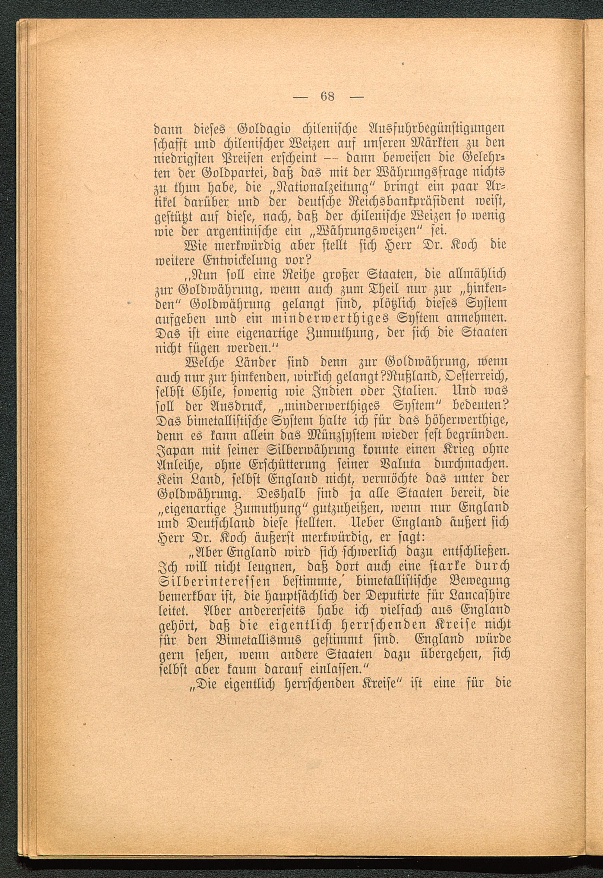 Welche Länder sind denn zur Goldwährung, wennauch nur zur hinkenden, wirkich gelangt?Rußland , Oesterreich,selbst Chile, sowenig wie Indien oder Italien . Und wassoll der Ausdruck, „minderwerthiges System" bedeuten?Das bimetallistische System halte ich für das höherwerthige,denn es kann allein das Münzsystem wieder fest begründen.Japan mit seiner Silberwährung konnte einen Krieg ohneAnleihe, ohne Erschütterung seiner Valuta durchmachen.Kein Land, selbst England nicht, vermöchte das unter derGoldwährung. Deshalb sind ja alle Staaten bereit, die„eigenartige Zumuthung" gutzuheißen, wenn nur England und Deutschland diese stellten. Ueber England äußert sichHerr Dr. Koch äußerst merkwürdig, er sagt: