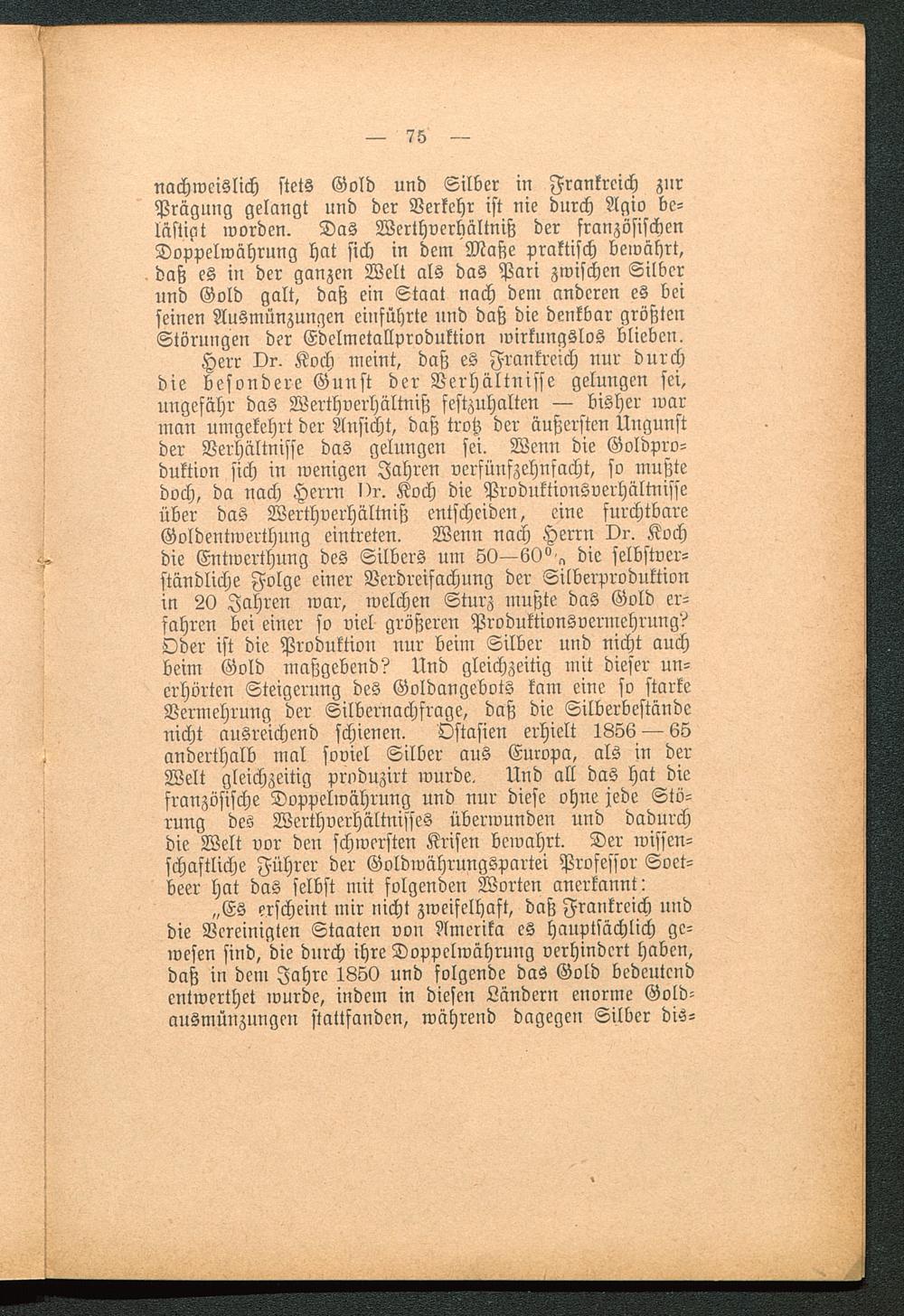 „Es erscheint mir nicht zweifelhaft, daß Frankreich unddie Vereinigten Staaten von Amerika es hauptsächlich ge-wesen sind, die durch ihre Doppelwährung verhindert haben,daß in dem Jahre 1850 und folgende das Gold bedeutendentwerthet wurde, indem in diesen Ländern enorme Gold-ausmünzungen stattfanden, während dagegen Silber dis-