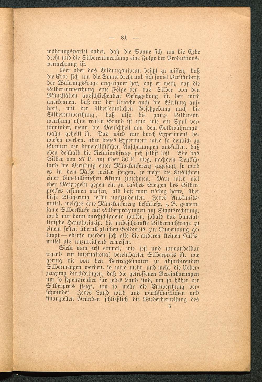 Wer aber das Bildungsniveau besitzt zu wissen, daßdie Erde sich um die Sonne dreht und sich soviel Verständnißder Währungsfrage angeeignet hat, daß er weiß, daß dieSilberentwerthung eine Folge der das Silber von denMünzstätten ausschließenden Gesetzgebung ist, der wirdanerkennen, daß mit der Ursache auch die Wirkung auf-hört, mit der silberfeindlichen Gesetzgebung auch dieSilberentwerthung, daß also die ganze Silberent-werthung ohne realen Grund ist und wie ein Spuk ver-schwindet, wenn die Menschheit von dem Goldwährungs-wahn geheilt ist. Das wird nur durch Experiment be-wiesen werden, aber dieses Experiment wird so deutlich zuGunsten der bimetallistischen Anschauungen ausfallen, daßeben deßhalb die Relationsfrage sich selbst löst. Wie dasSilber von 27 ?. auf über 30 ?, stieg, nachdem Deutsch-land die Berufung einer Münzkonferenz zugesagt, so wirdes in dem Maße weiter steigen, je mehr die Aussichteneiner bimetallistischen Aktion zunehmen. Man wird vieleher Maßregeln gegen ein zu rasches Steigen des Silber-preises ersinnen müssen, als daß man nöthig hätte, überdiese Steigerung selbst nachzudenken. Jedes Auskunfts-mittel, welches eine Münzkonserenz beschließt, z. B. gemein-same Silberkäufe mit Silberprägungen auf Staatsrechnung,wird nur dann durchschlagend wirken, sobald das bimetal-listische Hauptprinzip, die unbeschränkte Silbernachfrage zueinem festen überall gleichen Goldpreis zur Anwendung ge-langt — ebenso werden sich alle die anderen kleinen Hülfs-mittel als unzureichend erweisen.