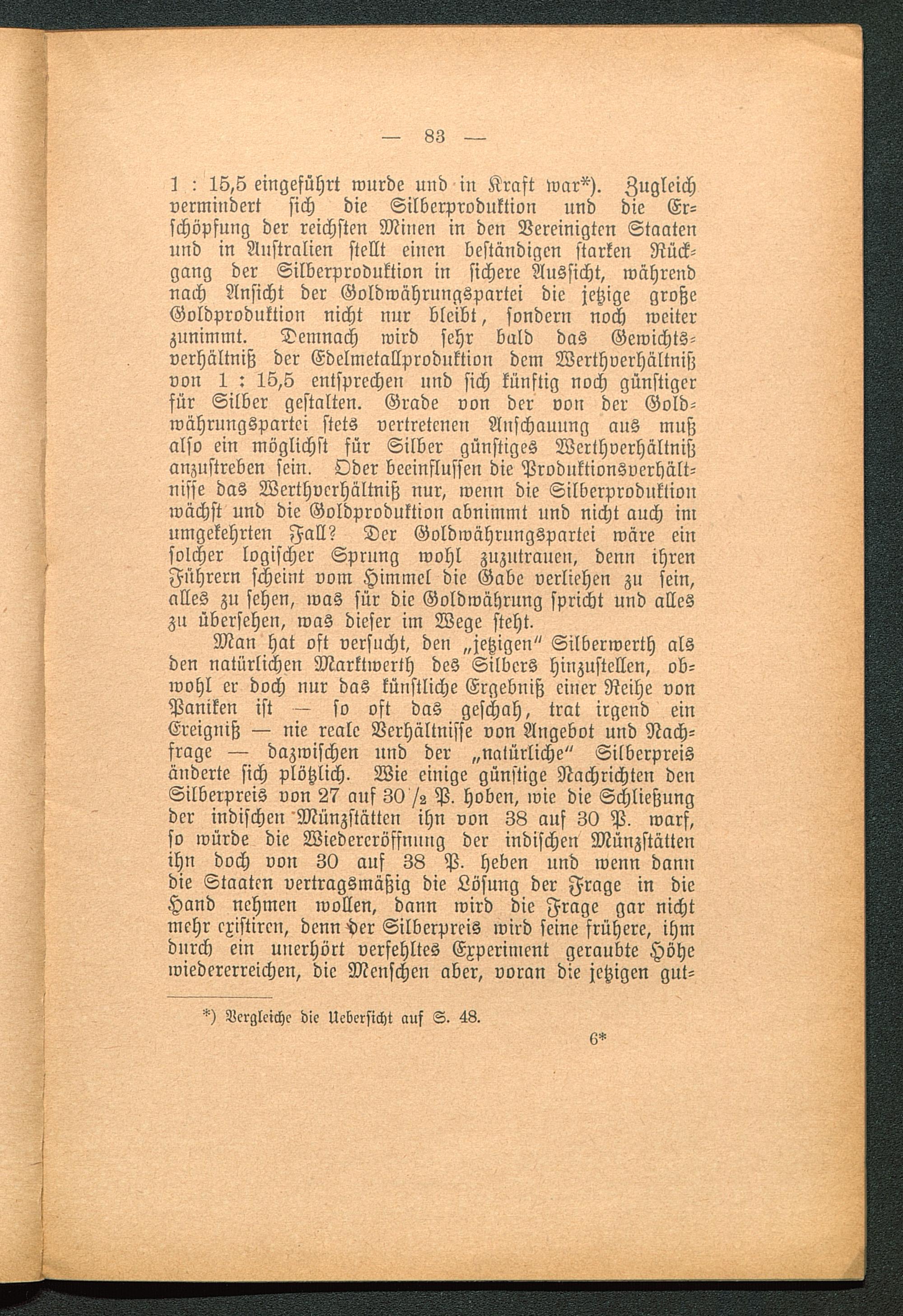 1 : 15,5 eingeführt wurde und in Kraft war"). Zugleichvermindert sich die Silberproduktion und die Er-schöpfung der reichsten Minen in den Vereinigten Staaten und in Australien stellt einen beständigen starken Rück-gang der Silberproduktion in sichere Aussicht, währenduach Ansicht der Goldwährungspartei die jetzige großeGoldproduktion nicht nur bleibt, sondern noch weiterzunimmt. Demnach wird sehr bald das Gewichts-verhältniß der Edelmetallproduktion dem Werthverhältnißvon 1 : 15,5 entsprechen und sich künftig noch günstigerfür Silber gestalten. Grade von der von der Gold-währungspartei stets vertretenen Anschauung ans mußalso ein möglichst für Silber günstiges Werthverhältnißanzustreben sein, Oder beeinflussen die Produktionsverhält-uisse das Werthverhältniß nur, wenn die Silberproduktiouwächst und die Goldproduktion abnimmt und nicht auch imumgekehrten Fall? Der Goldwährungspartei wäre einsolcher logischer Sprung wohl zuzutrauen, denn ihrenFührern scheint vom Himmel die Gabe verliehen zu sein,alles zu sehen, was für die Goldwährung spricht und alleszu übersehen, was dieser im Wege steht.