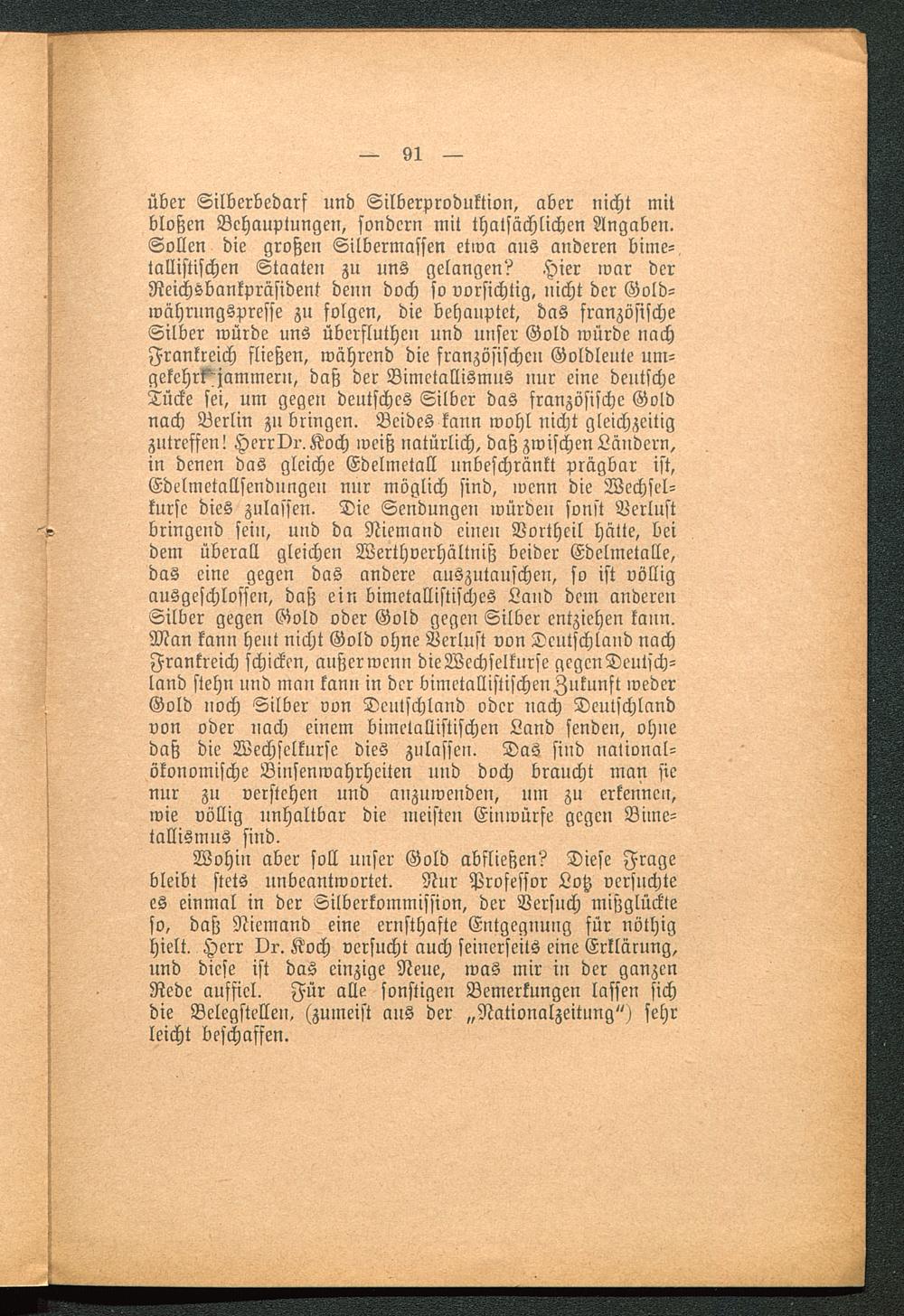 Wohin aber soll unser Gold abfließen? Diese Fragebleibt stets unbeantwortet. Nur Professor Lotz versuchtees einmal in der Silberkommission, der Versuch mißglückteso, daß Niemand eine ernsthafte Entgegnung für nöthighielt. Herr Dr. Koch versucht auch seinerseits eine Erklärung,und diese ist das einzige Neue, was mir in der ganzenRede auffiel. Für alle sonstigen Bemerkungen lassen sichdie Belegstellen, (zumeist aus der „Nationalzeitung") sehrleicht beschaffen.