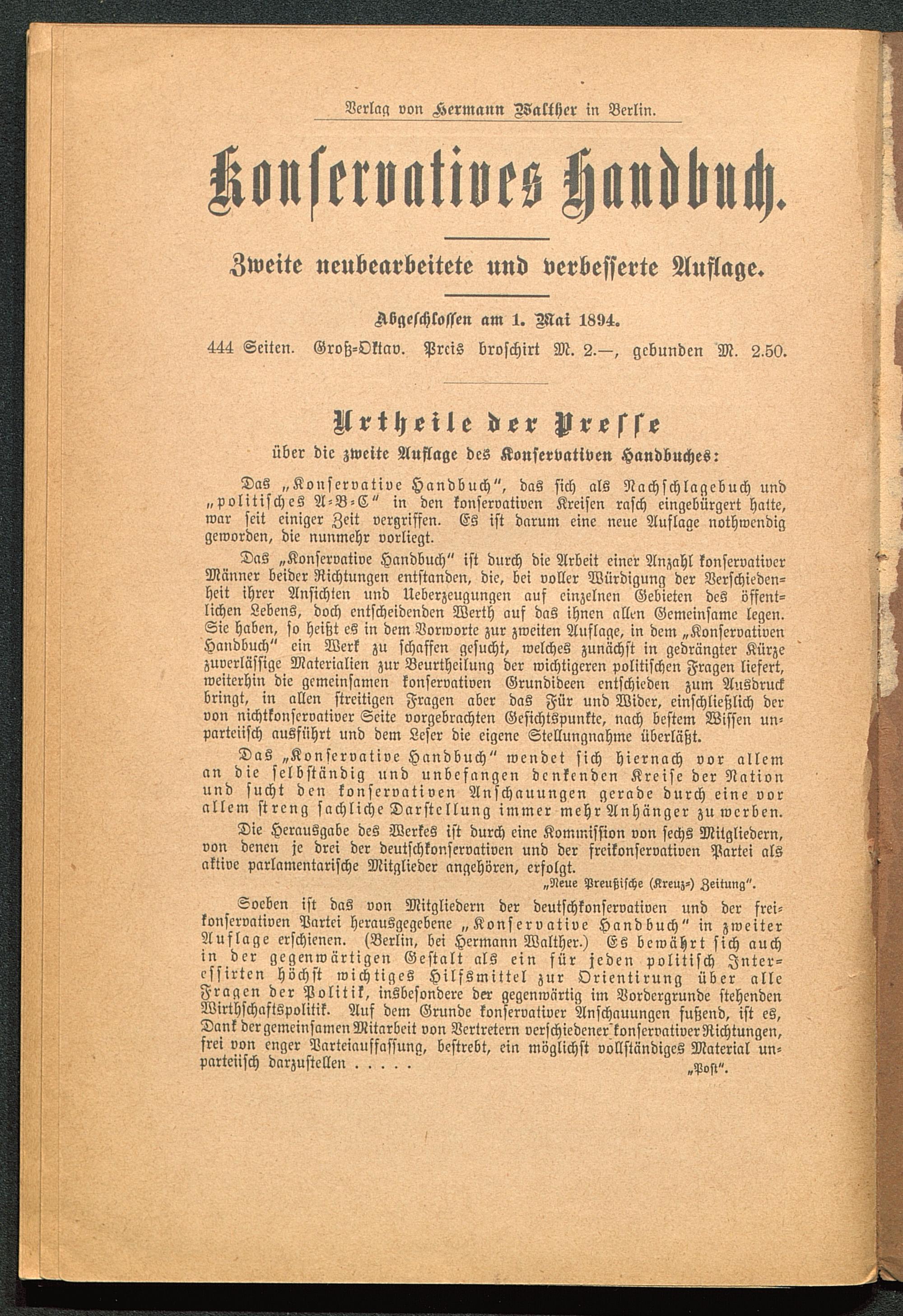 Das „Konservative Handbuch", das sich als Nachschlagebuch und„politisches A-B-C" in den konservativen Kreisen rasch eingebürgert hatte,war seit einiger Zeit vergriffen. Es ist darum eine neue Auflage nothwendiggeworden, die nunmehr vorliegt.