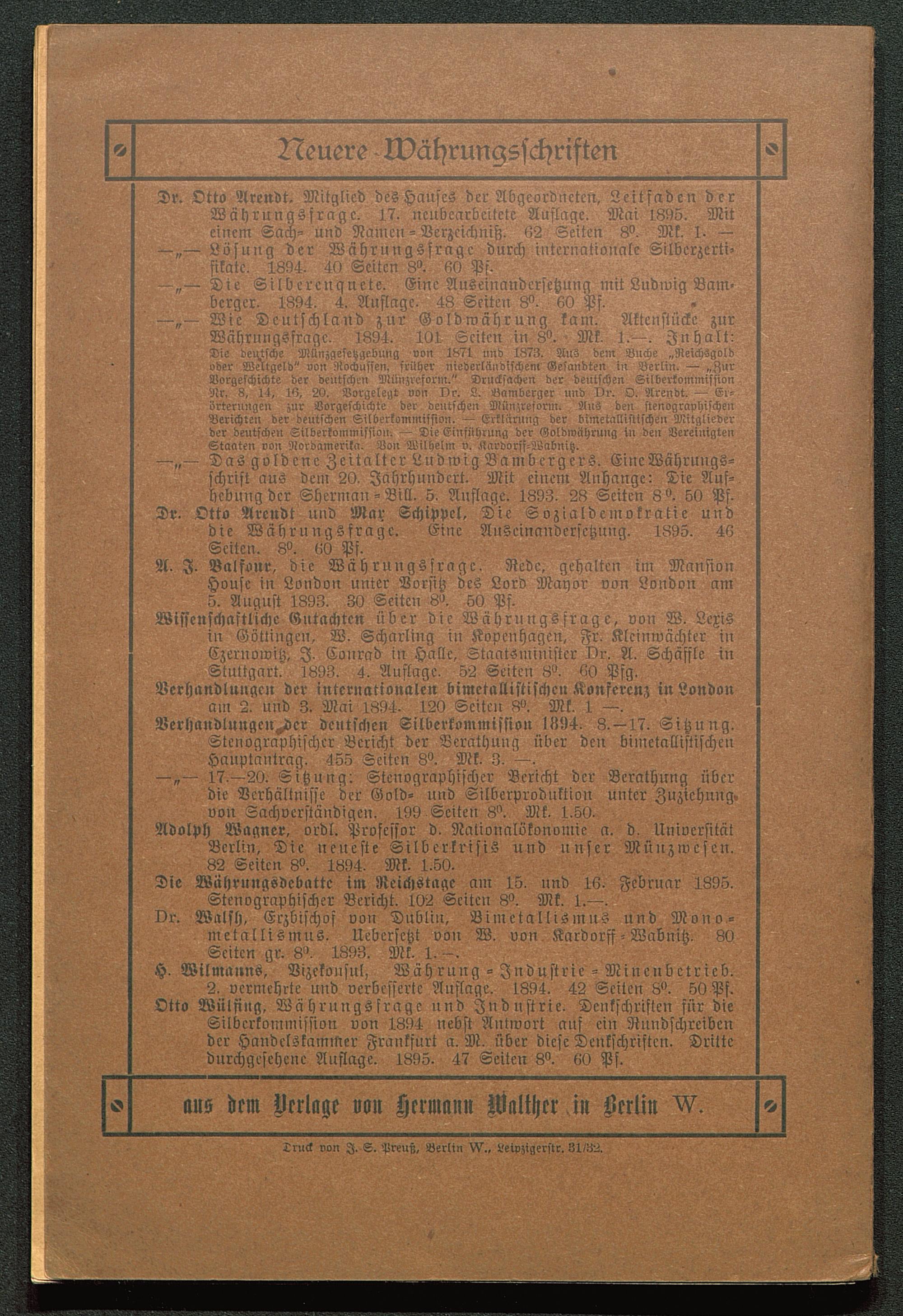 Dr. Walsh, Erzbischof von Dublin , Bimctallismus und Mono-metallismus. Uebcrsctzt von W. von Kardorff - Wabnitz. 80Seiten gr. 8'. 1893. Mk. 1. -.