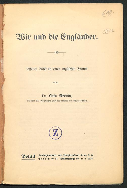 ir und die Engländer.Offener Brief an einen englischen FreundvonDr. Otto Arendt,Mitglied des Reichstags und des Hauses der Abgeordneten,s»sif^ Verlagsanstalt und Buchdruckerei G. m. b. H.^ Berlin W 57, Bülowstrahe 56. :: :: I9lS.