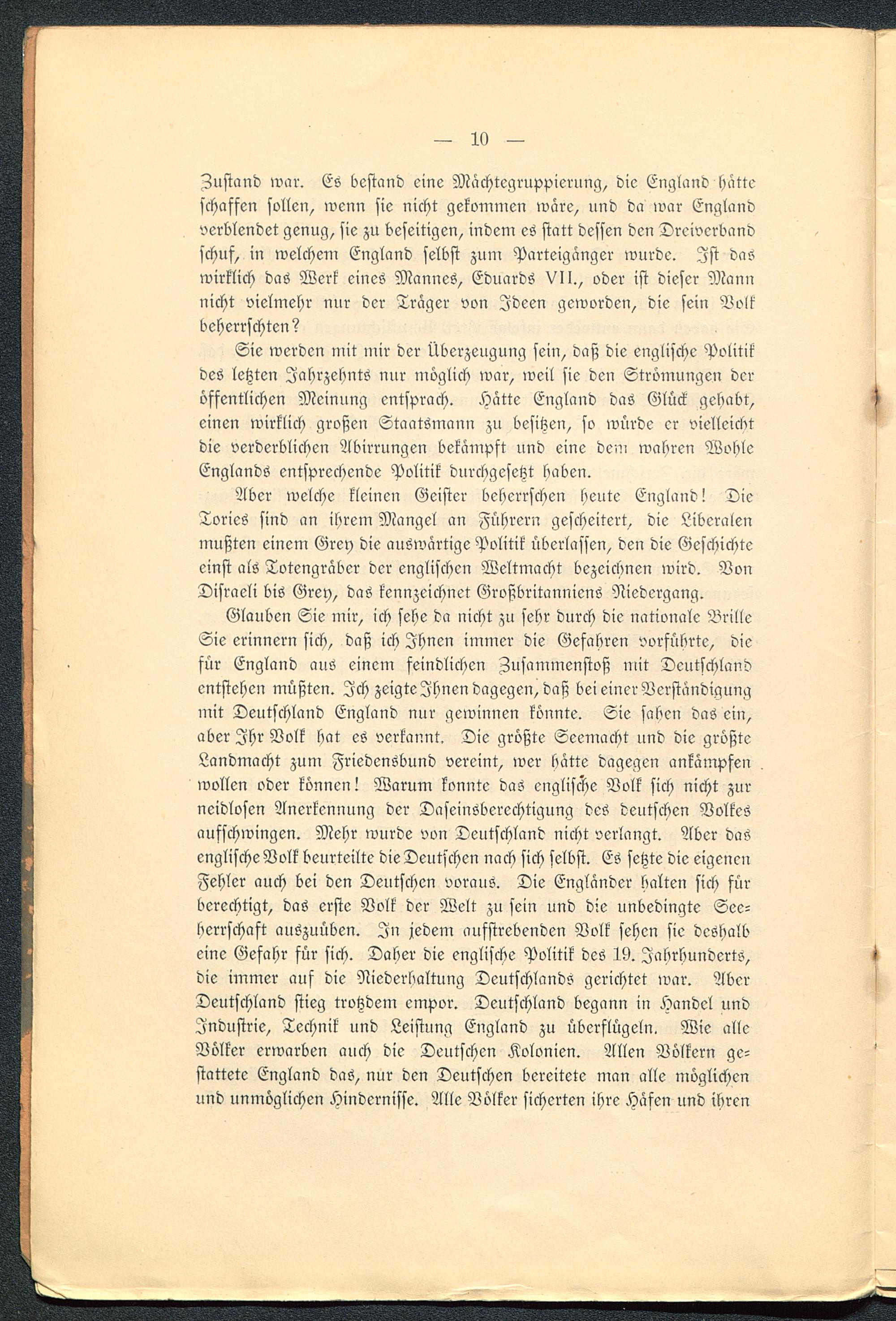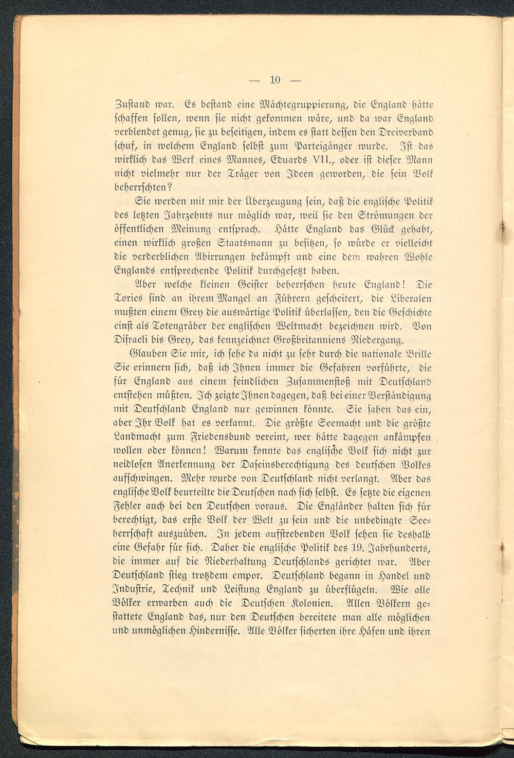 Sie werden mit nur der Überzeugung sein, daß die englische Politikdes letzten Jahrzehnts nur möglich war, weil sie den Strömungen deröffentlichen Meinung entsprach. Hätte England das Glück gehabt,einen wirklich großen Staatsmann zu besitzen, so würde er vielleichtdie verderblichen Abirrungen bekämpft und eine den, wahren WohleEnglands entsprechende Politik durchgesetzt haben.