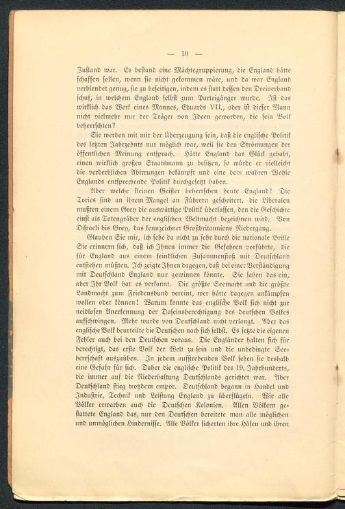 Aber welche kleinen Geister beherrschen heute England ! DieTorics sind an ihrem Mangel an Führern gescheitert, die Liberalenmußten einem Grey die auswärtige Politik überlassen, den die Geschichteeinst als Totengräber der englischen Weltmacht bezeichnen wird. VonDisracli bis Grey, das kennzeichnet Großbritanniens Niedergang.