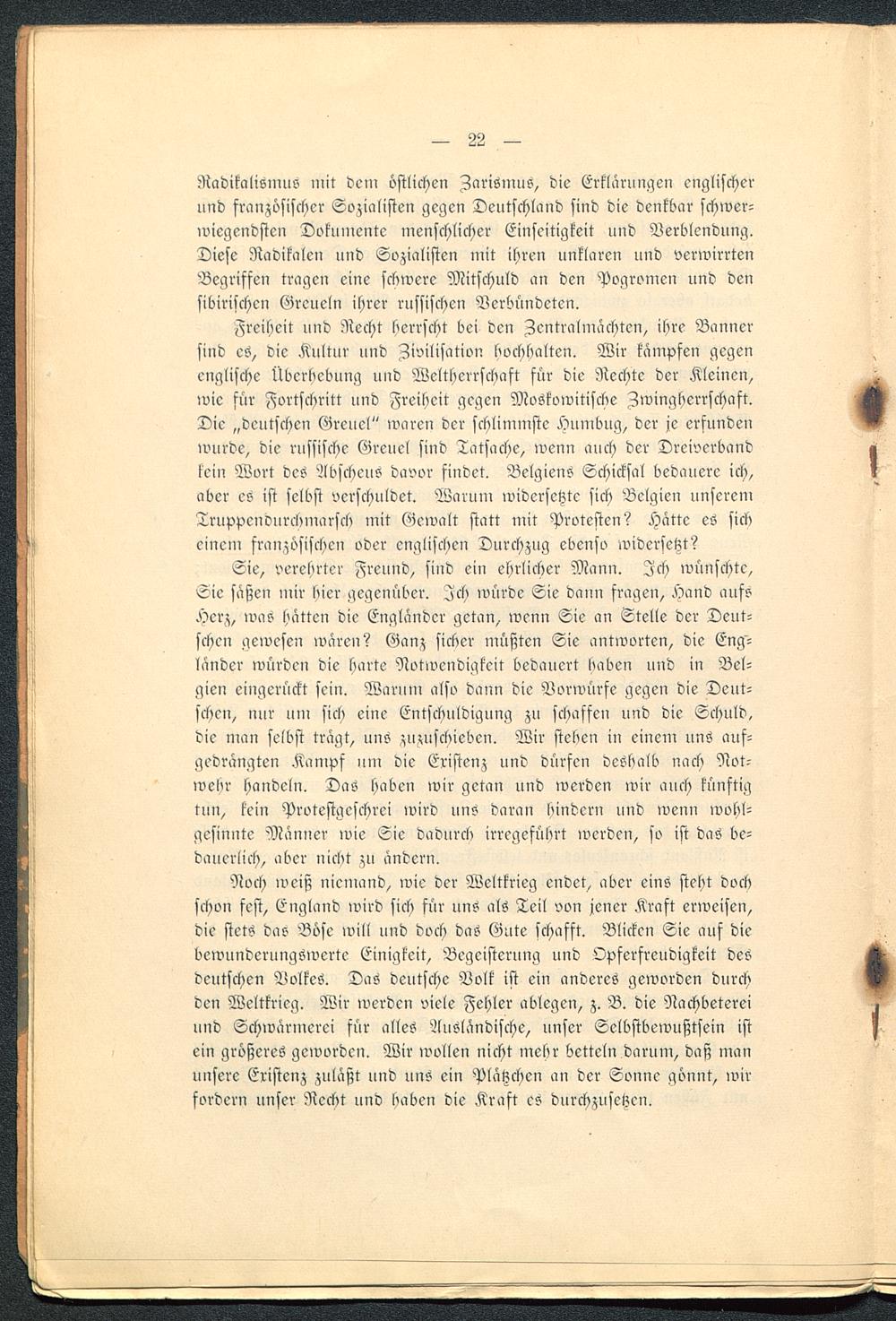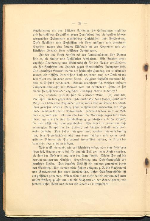 Radikalismus mit dem östlichen Zarismus, die Erklärungen englischerund französischer Sozialisten gegen Deutschland sind die denkbar schwer-wiegendsten Dokumente menschlicher Einseitigkeit und Verblendung.Diese Radikalen und Sozialisten mit ihren unklaren und verwirrtenBegriffen tragen eine schwere Mitschuld an den Pogromen und densibirischen Greueln ihrer russischen Verbündeten.