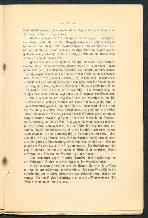 Bisher wurden Kriege zwischen zivilisierten Nationen so gefübrt,wie Kultur und Völkerrecht es vorschreiben. Die bewaffnete Macht be-kämpfte sich, der friedliche Bürger und das Privateigentum blieben un-verletzt. Warum ist dieser Weltkrieg nicht ebenso gefübrt worden? DieSchuld daran tragt nur England .