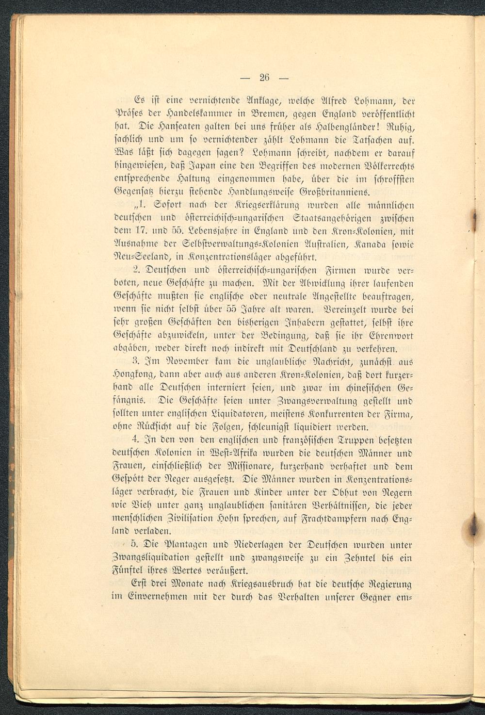 Z. Im November kam die unglaubliche Nachricht, zunächst aus.Hongkong , dann aber auch aus anderen Kron-Kolonien, daß dort kurzer-hand alle Deutschen interniert seien, und zwar im chinesischen Ge-fängnis. Die Geschäfte seien unter Zwangsverwaltung gestellt undsollten unter englischen Liquidatoren, meistens Konkurrenten der Firma,ohne Rücksicht auf die Folgen, schleunigst liquidiert werden.
