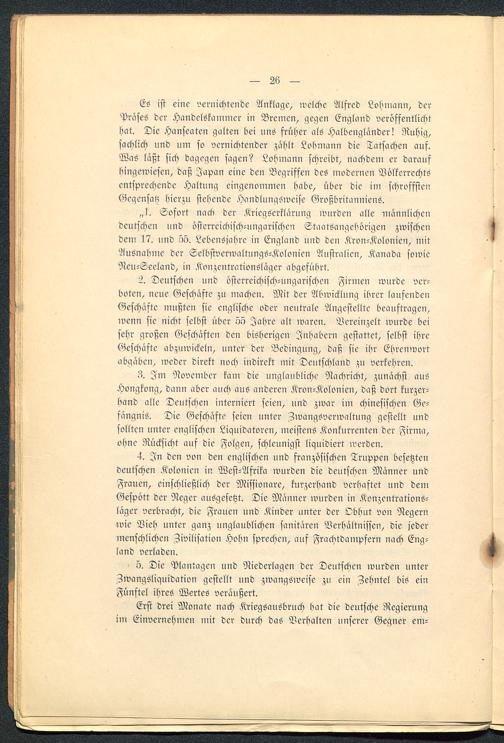 Es ist eine vernichtende Anklage, welche Alfred Lohmann , derPräses der Handelskammer in Bremen , gegen England veröffentlichthat. Die Hanseaten galten bei uns früher als Halbenglander! Ruhig,sachlich und um so vernichtender zählt Lobmann die Tatsachen aus.Was läßt sich dagegen sagen? Lohmann schreibt, nacbdem er daraufbingewiesen, daß Japan eine den Begriffen des modernen Völkerrechtsentsprechende Haltung eingenommen habe, über die im schroffstenGegensatz hierzu stehende .nandlungSweisc Großbritanniens .