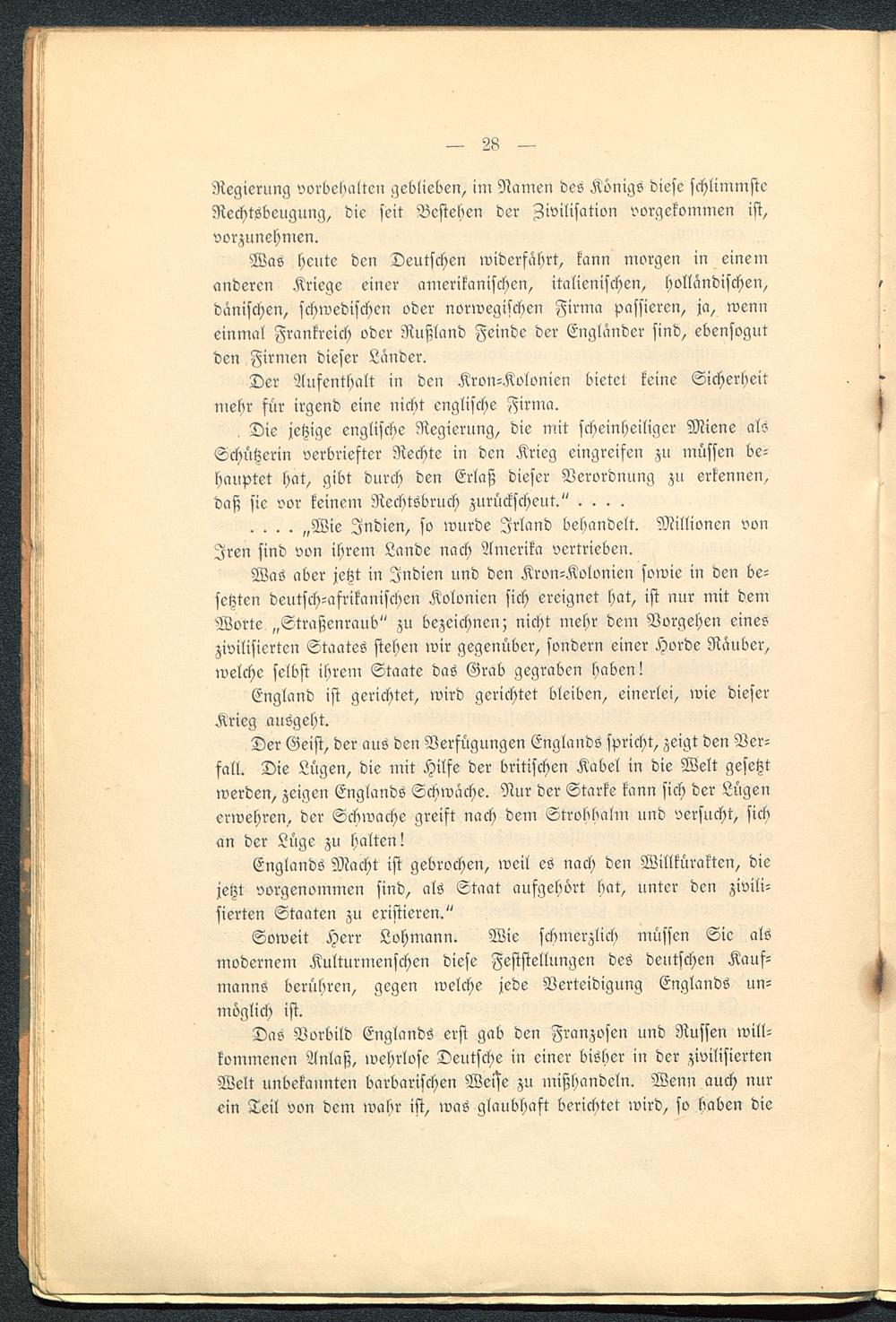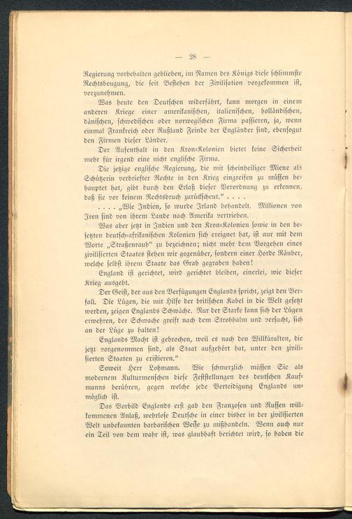 Soweit Herr Lohmann. Wie schmerzlich müssen Sie alsmodernen: Kulturmenschen diese Feststellungen des deutschen Kauf-manns berühren, gegen welche jede Verteidigung Englands un-möglich ist.