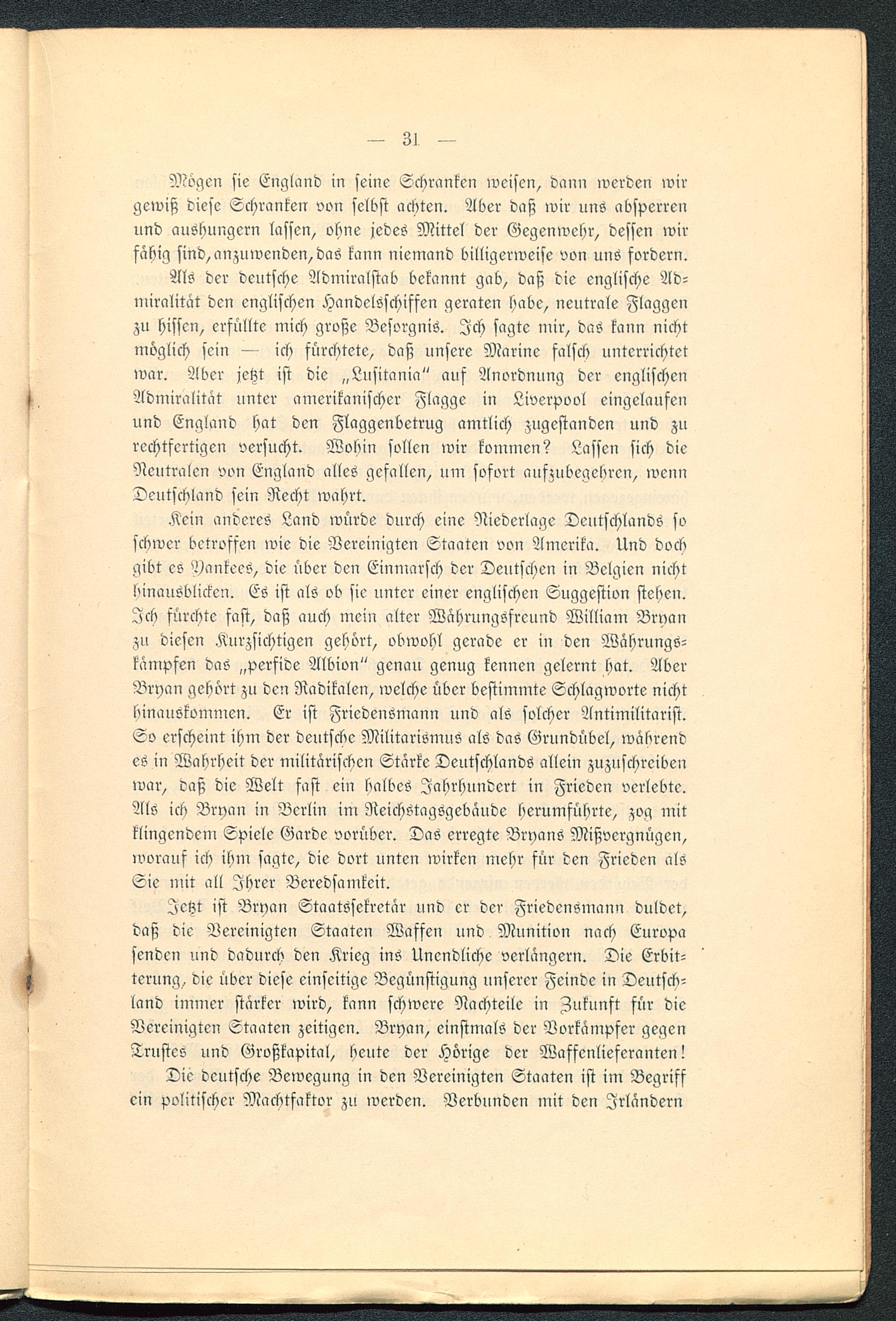 Kein anderes Land würde durch eine Niederlage Deutschlands soschwer betroffen wie die Vereinigten Staaten von Amerika . Und dochgibt es Yankees, die über den Einmarsch der Deutschen in Belgien nichthinausblicken. Es ist als ob sie unter einer englischen Suggestion stehen.Ich fürchte fast, daß auch mein alter Währungsfrcund William Bryan zu diesen Kurzsichtigen gehört, obwohl gerade er in den Währungs-kämpfen das „perfide Albion" genau genug kennen gelernt hat. AberBryan gehört zu den Radikalen, welche über bestimmte Schlagworte nichthinauskommen. Er ist Fricdensmann und als solcher Antimilitarist.So erscheint ihm der deutsche Militarismus als das Grundübel, wäbrendes in Wahrheit der militärischen Stärke Deutschlands allein zuzuschreibenwar, Laß die Welt fast ein balbes Jahrhundert in Frieden verlebte.Als ich Bryan in Berlin ini Reichstagsgebäude herumführte, zog mitklingendem Spiele Garde vorüber. Das erregte Bryans Mißvergnügen,worauf ich ihm sagte, die dort unten wirken mehr für den Frieden alsSie mit all Ihrer Beredsamkeit.