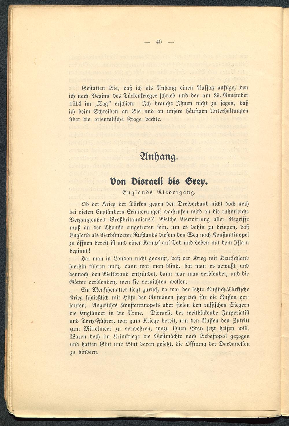 Ob der Krieg der Türken gegen den Dreiverband nicht doch nochbei vielen Englandern Erinnerungen wachrufen wird an die ruhmreicheVergangenheit Großbritanniens? Welche Verwirrung aller Begriffemuß an der Themse eingetreten sein, um es dahin zu bringen, daßEngland als Verbündeter Rußlands diesem den Weg nach Konstantinopelzu öffnen bereit ist und einen Kampf auf Tod und Leben mit dem Islambeginnt!