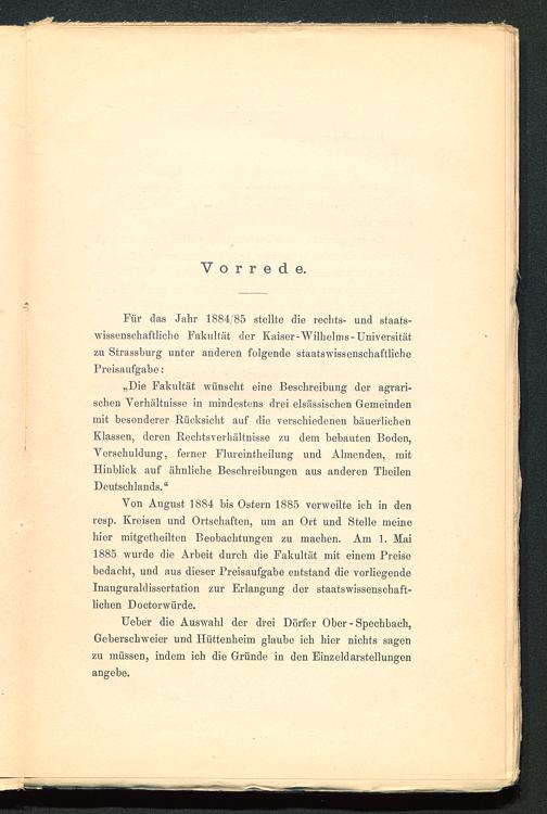 „Die Fakultät wünscht eine Beschreibung der agrari-schen Verhältnisse in mindestens drei elsässischen Gemeindenmit besonderer Rücksicht auf die verschiedenen bäuerlichenKlassen, deren Rechtsverhältnisse zu dem behauten Boden,Verschuldung, ferner Flureintheilung und Almenden, mitHinblick auf ähnliche Beschreibungen aus anderen TheilenDeutschlands .“