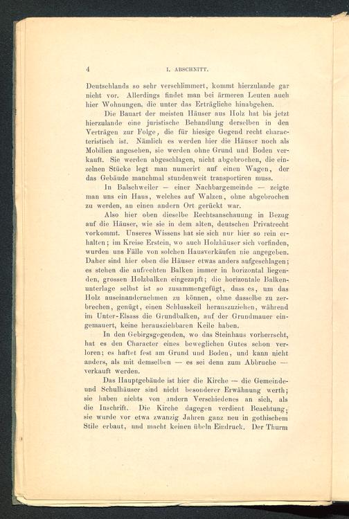 Also hier oben dieselbe Rechtsanschauung in Bezugauf die Häuser, wie sie in dem alten, deutschen Privatrechtvorkommt. Unseres Wissens hat sie sich nur hier so rein er-halten ; im Kreise Erstein , wo auch Holzhäuser sich vorfinden,wurden uns Fälle von solchen Hausverkäufen nie angegeben.Daher sind hier oben die Häuser etwas anders aufgeschlagen;es stehen die aufrechten Balken immer in horizontal liegen-den, grossen Holzbalken eingezapft; die horizontale Balken-unterlage selbst ist so zusammengefiigt, dass es, um dasHolz auseinandernehmen zu können, ohne dasselbe zu zer-brechen, genügt, einen Schlusskeil herauszuziehen, währendim Unter-Elsass die Grundbalken, auf der Grundmauer ein-gemauert, keine herausziehbaren Keile haben.