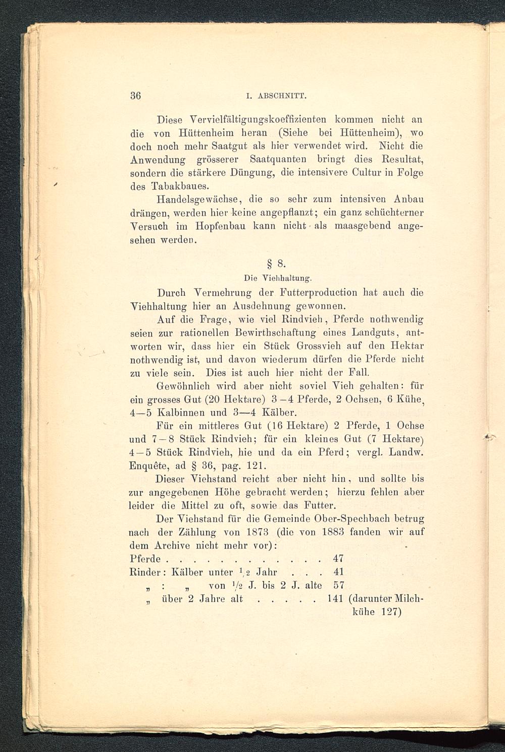 Der Viehstand für die Gemeinde Ober-Spechbach betrugnach der Zählung von 1873 (die von 1883 fanden wir aufdem Archive nicht mehr vor):