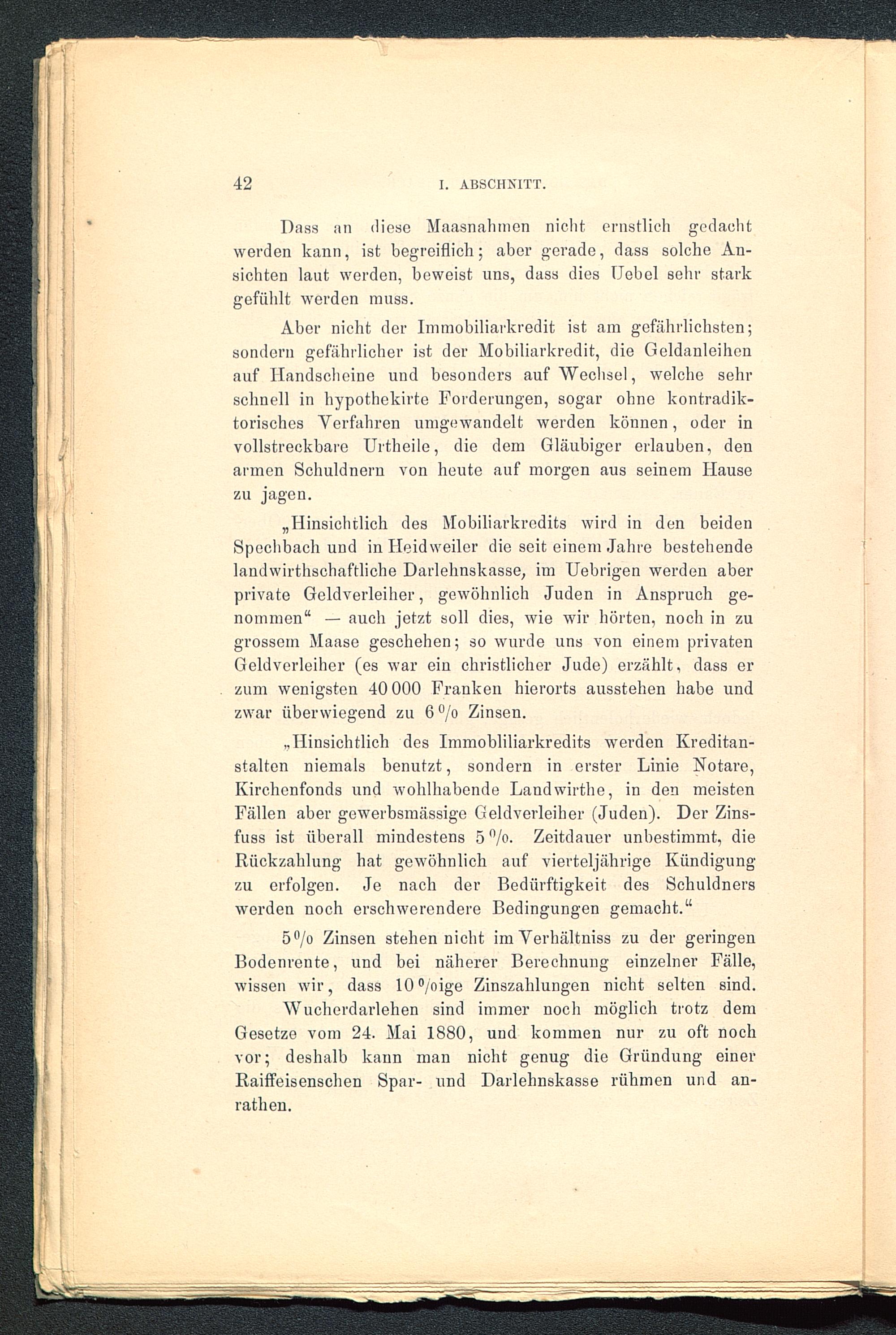 „Hinsichtlich des Mobiliarkredits wird in den beidenSpechbach und in Ileidweiler die seit einem Jahre bestehendelandwirtschaftliche Darlehnskasse, im Uebrigen werden aberprivate Geldverleiher, gewöhnlich Juden in Anspruch ge-nommen“ — auch jetzt soll dies, wie wir hörten, noch in zugrossem Maase geschehen; so wurde uns von einem privatenGeldverleiher (es war ein christlicher Jude) erzählt, dass erzum wenigsten 40 000 Franken hierorts ausstehen habe undzwar überwiegend zu 6°/o Zinsen.