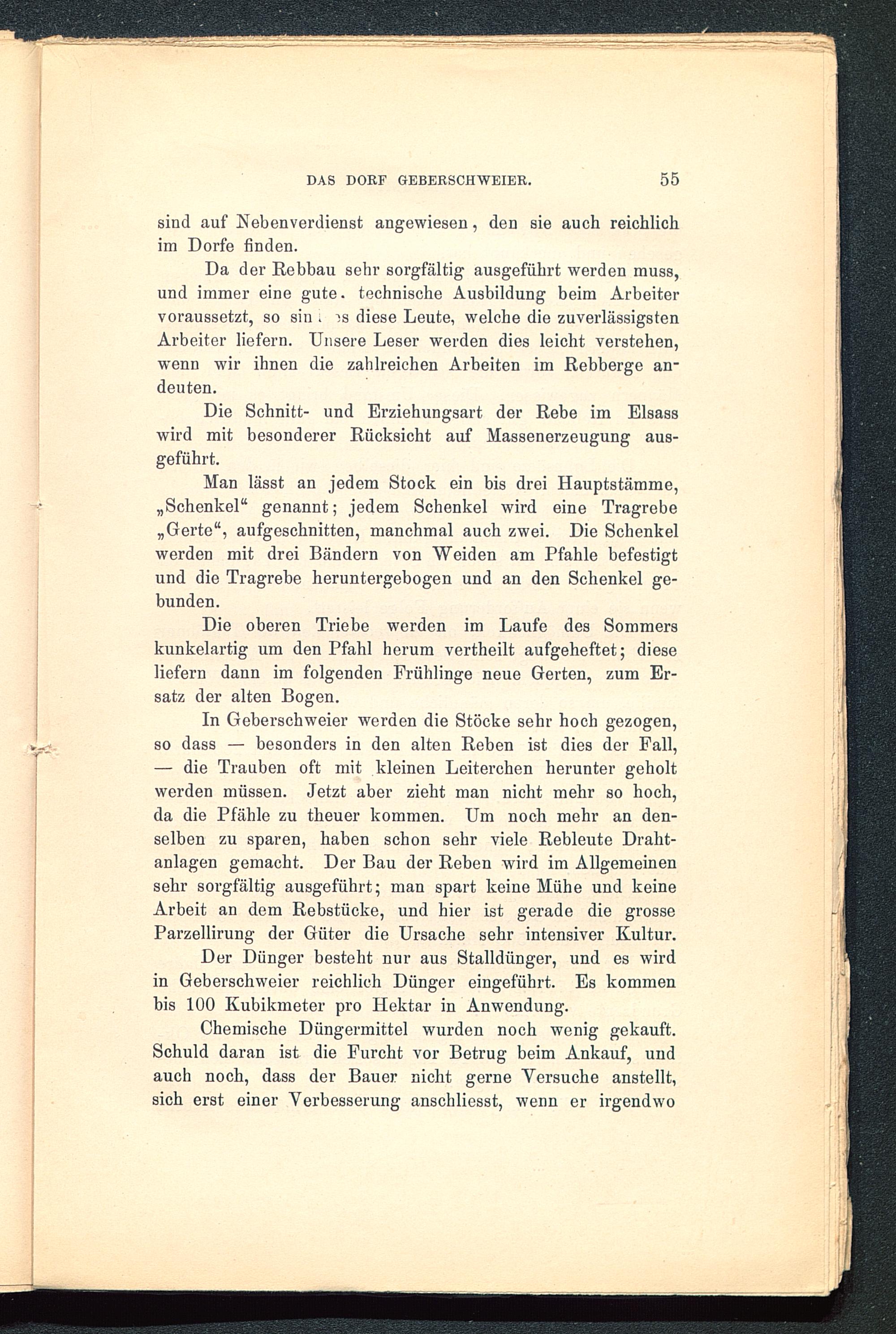 In Geberschweier werden die Stöcke sehr hoch gezogen,so dass — besonders in den alten Reben ist dies der Fall,— die Trauben oft mit kleinen Leiterchen herunter geholtwerden müssen. Jetzt aber zieht man nicht mehr so hoch,da die Pfähle zu theuer kommen. Um noch mehr an den-selben zu sparen, haben schon sehr viele Rebleute Draht-anlagen gemacht. Der Bau der Reben wird im Allgemeinensehr sorgfältig ausgeführt; man spart keine Mühe und keineArbeit an dem Rebstücke, und hier ist gerade die grosseParzellirung der Güter die Ursache sehr intensiver Kultur.