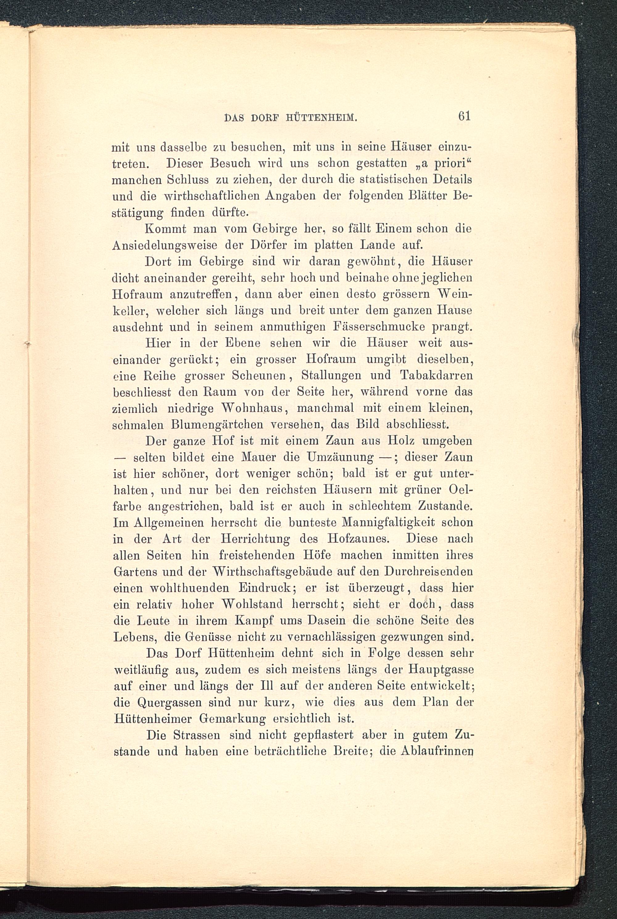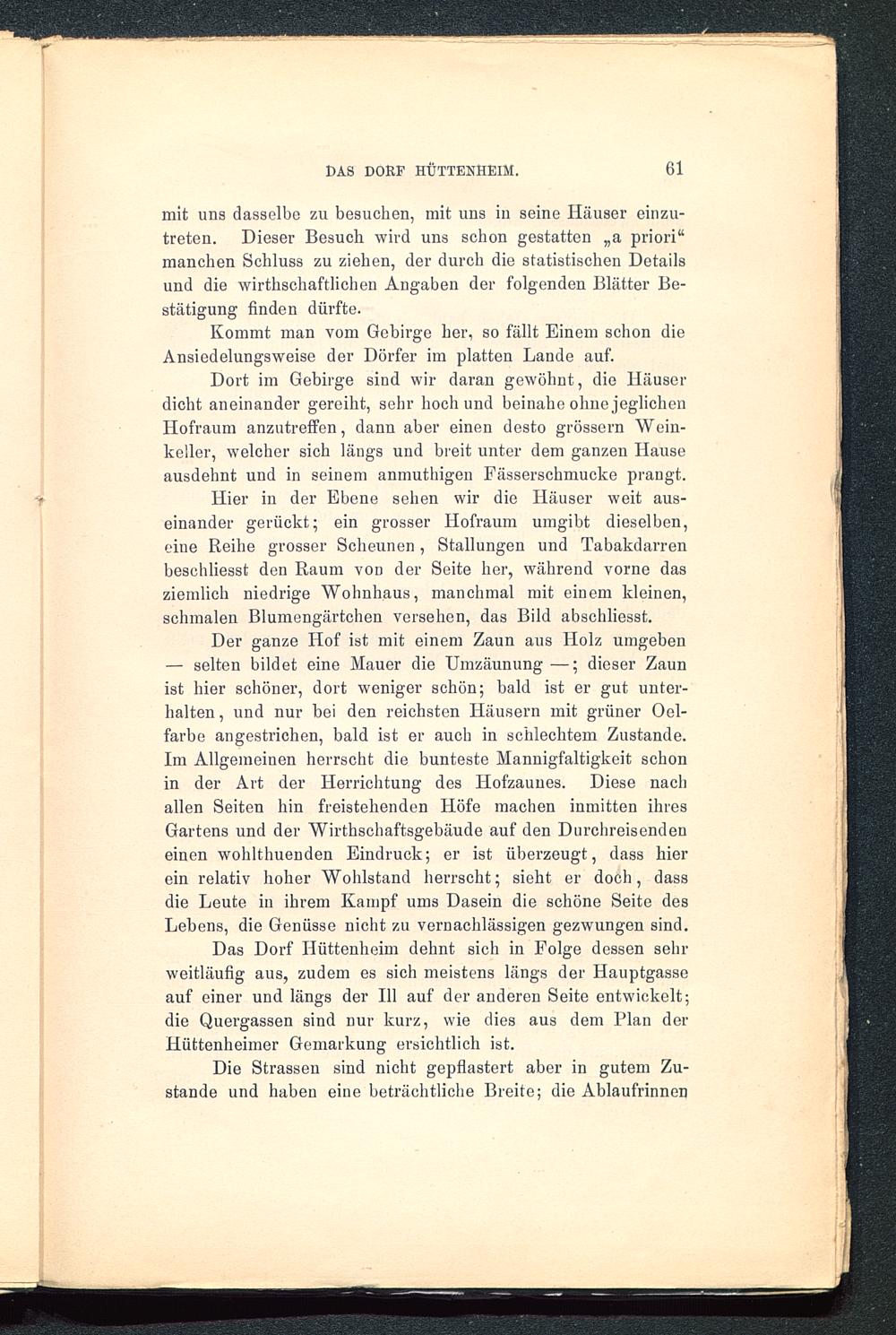 Das Dorf Hüttenheim dehnt sich in Folge dessen sehrweitläufig aus, zudem es sich meistens längs der Hauptgasseauf einer und längs der 111 auf der anderen Seite entwickelt;die Quergassen sind nur kurz, wie dies aus dem Plan derHüttenheimer Gemarkung ersichtlich ist.