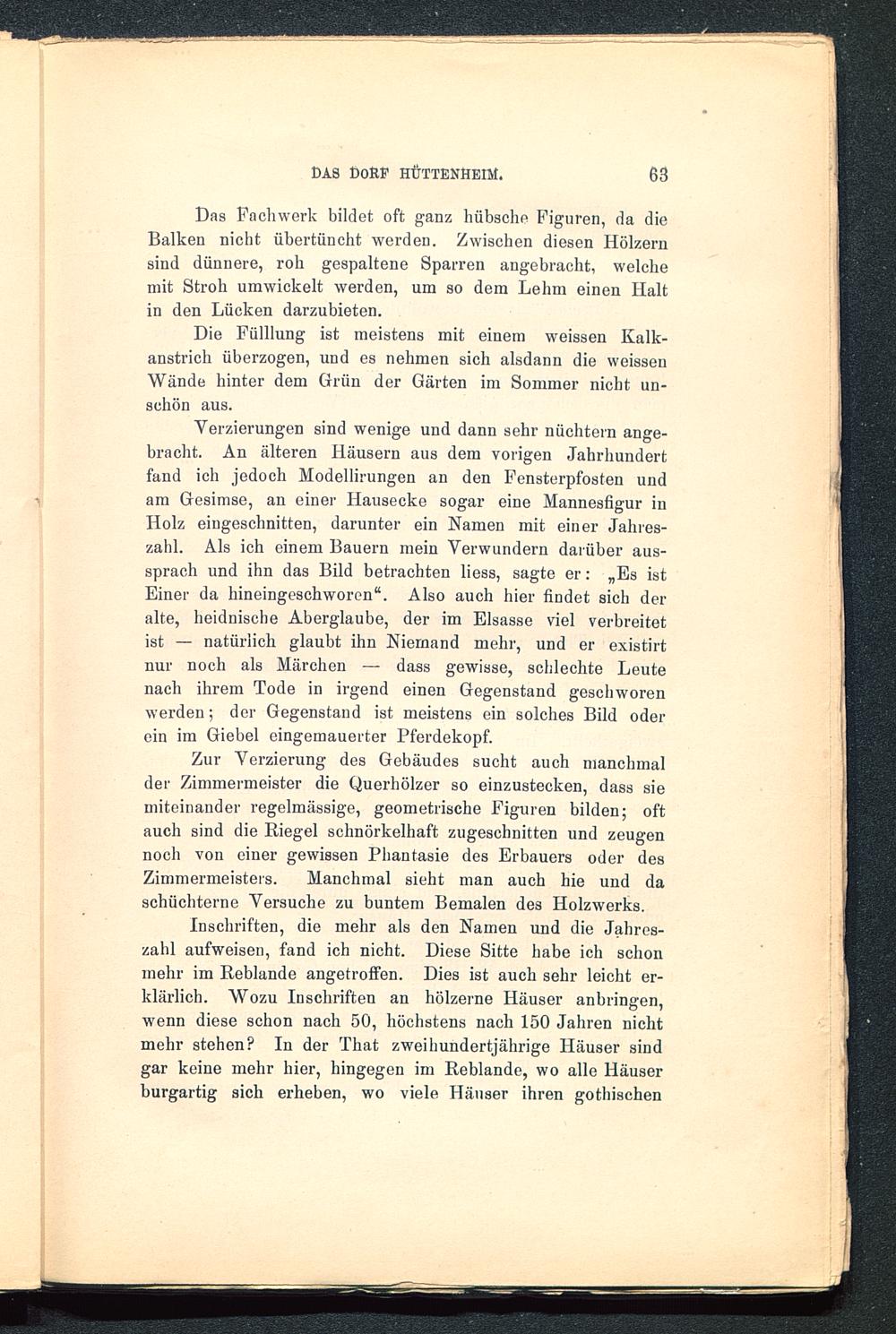 Inschriften, die mehr als den Namen und die Jahres-zahl aufweisen, fand ich nicht. Diese Sitte habe ich schonmehr im Reblande angetroffen. Dies ist auch sehr leicht er-klärlich. Wozu Inschriften an hölzerne Häuser anbringen,wenn diese schon nach 50, höchstens nach 150 Jahren nichtmehr stehen? In der That zweihundertjährige Häuser sindgar keine mehr hier, hingegen im Reblande, wo alle Häuserburgartig sich erheben, wo viele Häuser ihren gothischen