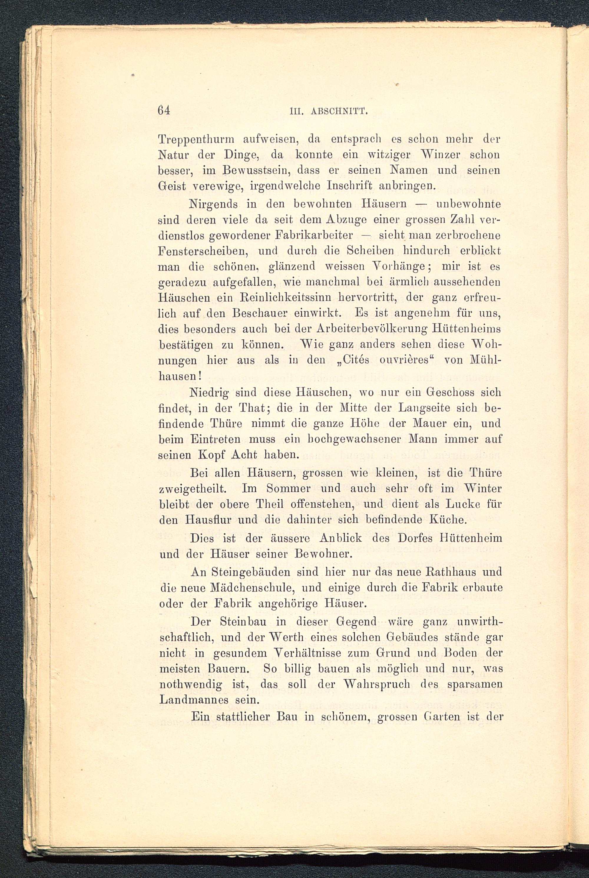 Nirgends in den bewohnten Häusern — unbewohntesind deren viele da seit dem Abzüge einer grossen Zahl ver-dienstlos gewordener Fabrikarbeiter — sieht man zerbrocheneFensterscheiben, und durch die Scheiben hindurch erblicktman die schönen, glänzend weissen Vorhänge; mir ist esgeradezu aufgefallen, wie manchmal bei ärmlich aussehendeuHäuschen ein Reinlichkeitssinn hervortritt, der ganz erfreu-lich auf den Beschauer einwirkt. Es ist angenehm für uns,dies besonders auch bei der Arbeiterbevölkerung Hüttenheimsbestätigen zu können. Wie ganz anders sehen diese Woh-nungen hier aus als in den „Cites ouvrieres “ von Mühl-hausen !