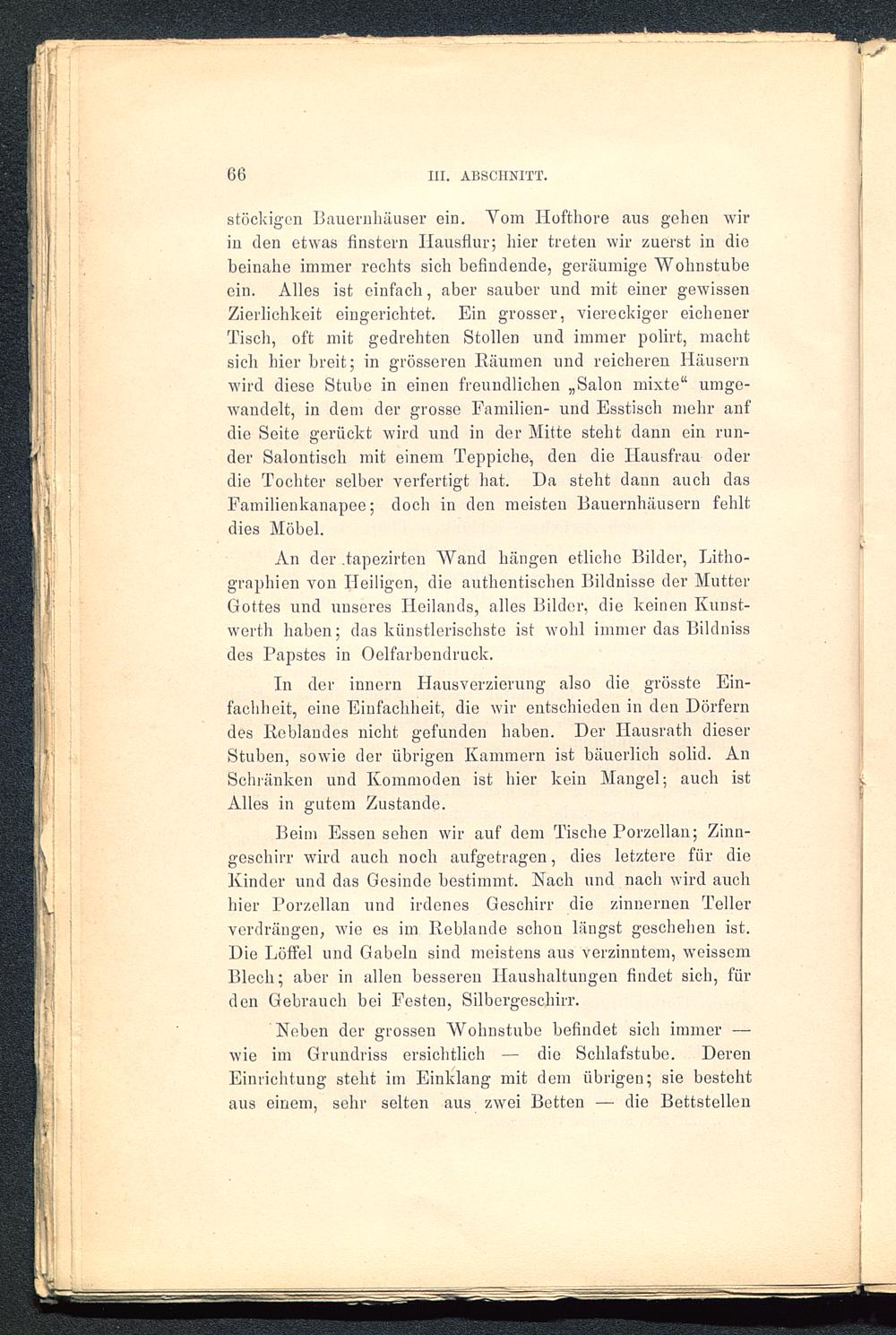 An der tapezirten Wand hängen etliche Bilder, Litho-graphien von Heiligen, die authentischen Bildnisse der MutterGottes und unseres Heilands, alles Bilder, die keinen Kunst-werth haben; das künstlerischste ist wohl immer das Bildnissdes Papstes in Oelfarbendruck.