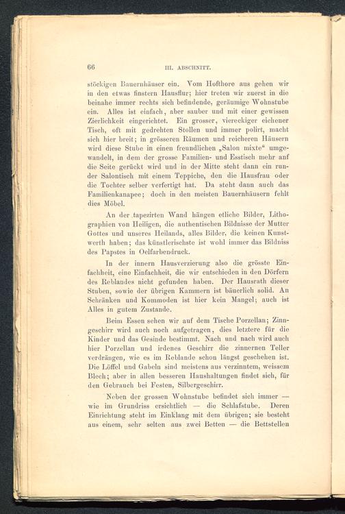 In der innern Ilausverzierung also die grösste Ein-fachheit, eine Einfachheit, die wir entschieden in den Dörferndes Reblandes nicht gefunden haben. Der Hausrath dieserStuben, sowie der übrigen Kammern ist bäuerlich solid. AnSchränken und Kommoden ist hier kein Mangel; auch istAlles in gutem Zustande.