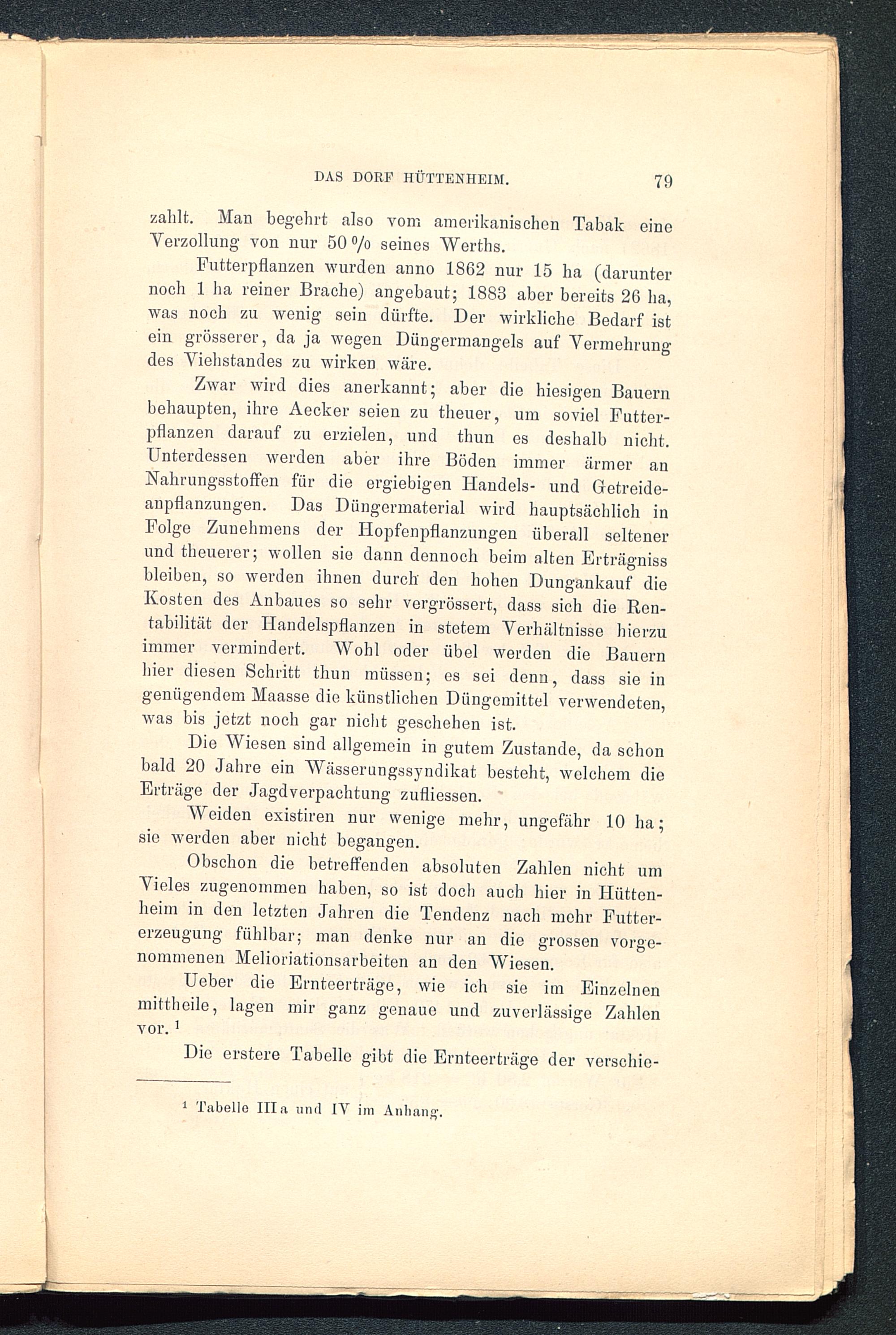 Futterpflanzen wurden anno 1862 nur 15 ha (darunternoch 1 ha reiner Brache) angebaut; 1883 aber bereits 26 ha,was noch zu wenig sein dürfte. Der wirkliche Bedarf istein grösserer, da ja wegen Düngermangels auf Vermehrungdes Viehstandes zu wirken wäre.