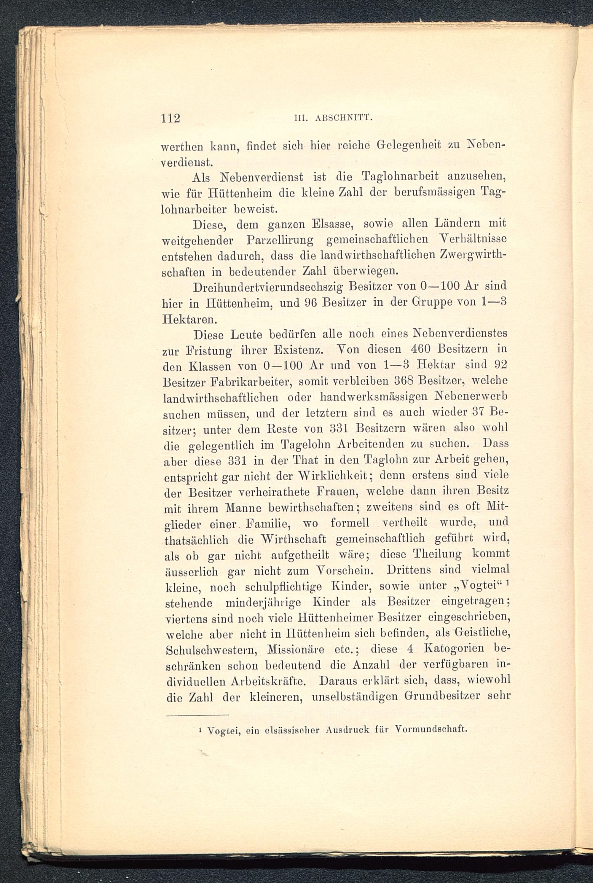 Diese Leute bedürfen alle noch eines Nebenverdiensteszur Fristung ihrer Existenz. Von diesen 460 Besitzern inden Klassen von 0 — 100 Ar und von 1—3 Hektar sind 92Besitzer Fabrikarbeiter, somit verbleiben 368 Besitzer, welchelandwirthschaftlichen oder handwerksmässigen Nebenerwerbsuchen müssen, und der letztem sind es auch wieder 37 Be-sitzer; unter dem Reste von 331 Besitzern wären also wohldie gelegentlich im Tagelohn Arbeitenden zu suchen. Dassaber diese 331 in der That in den Taglohn zur Arbeit gehen,entspricht gar nicht der Wirklichkeit; denn erstens sind vieleder Besitzer verheirathete Frauen, welche dann ihren Besitzmit ihrem Manne bewirthschaften; zweitens sind es oft Mit-glieder einer Familie, wo formell vertheilt wurde, undthatsächlich die Wirthschaft gemeinschaftlich geführt wird,als ob gar nicht aufgetheilt wäre; diese Theilung kommtäusserlich gar nicht zum Vorschein. Drittens sind vielmalkleine, noch schulpflichtige Kinder, sowie unter „Vogtei“ 1stehende minderjährige Kinder als Besitzer eingetragen;viertens sind noch viele liüttenhcimer Besitzer eingeschrieben,welche aber nicht in Ilüttenheim sicli befinden, als Geistliche,Schulschwestern, Missionäre etc.; diese 4 Katogorien be-schränken schon bedeutend die Anzahl der verfügbaren in-dividuellen Arbeitskräfte. Daraus erklärt sich, dass, wiewohldie Zahl der kleineren, unselbständigen Grundbesitzer sehr