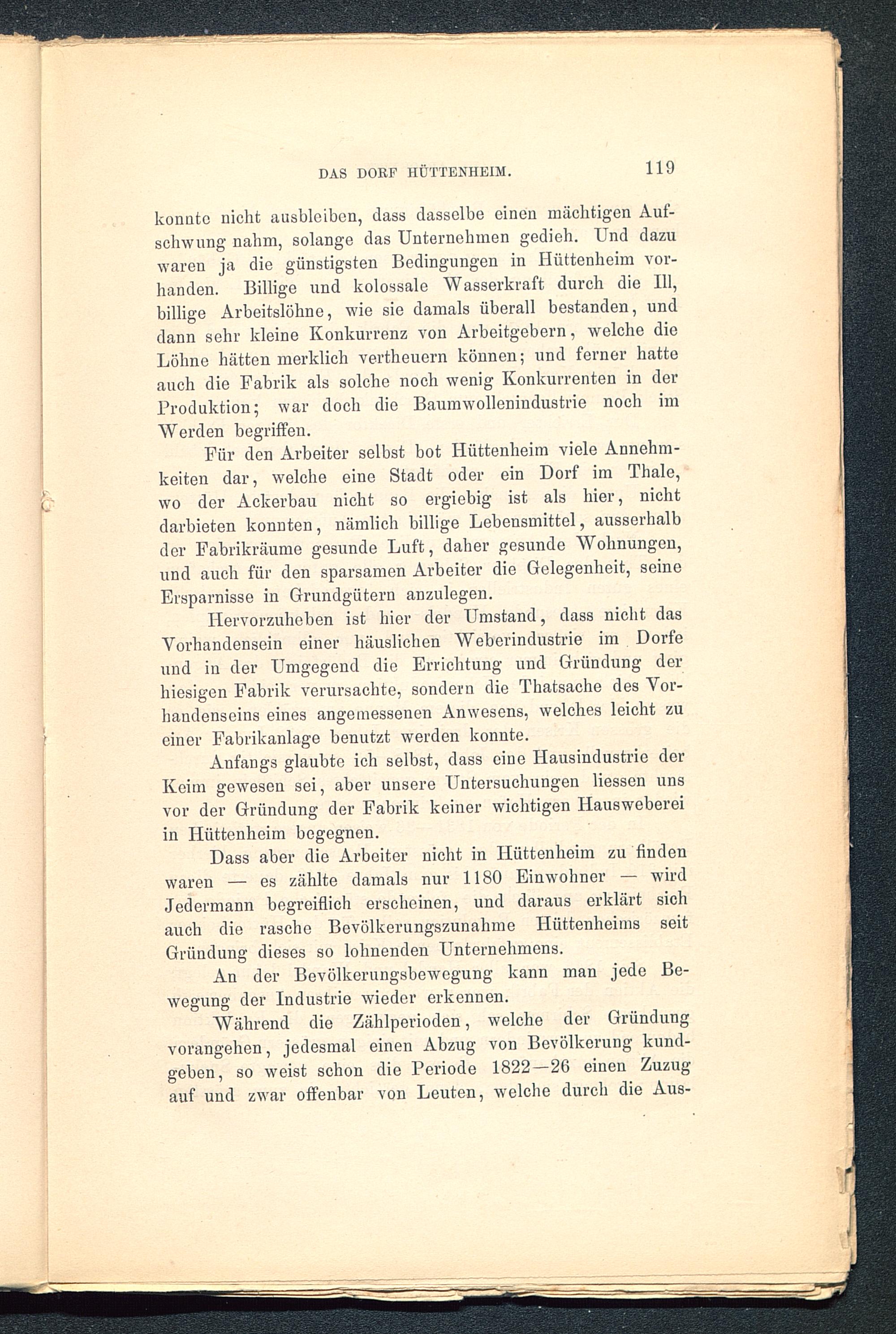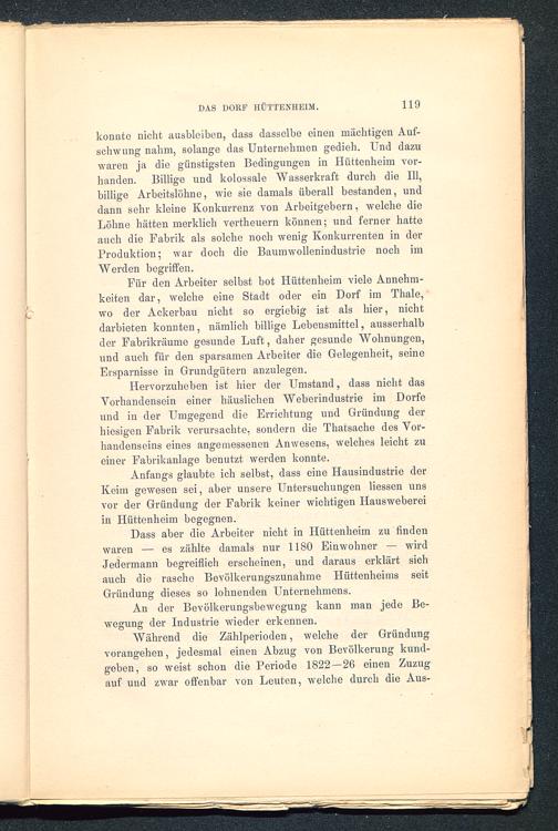 konnte nicht ausbloibcn, dass dasselbe einen mächtigen Auf-schwung nahm, solange das Unternehmen gedieh. Und dazuwaren ja die günstigsten Bedingungen in Hüttenheim vor-handen. Billige und kolossale Wasserkraft durch die 111,billige Arbeitslöhne, wie sie damals überall bestanden, unddann sehr kleine Konkurrenz von Arbeitgebern, welche dieLöhne hätten merklich vertheuern können; und ferner hatteauch die Fabrik als solche noch wenig Konkurrenten in derProduktion; war doch die Baumwollenindustrie noch imWerden begriffen.