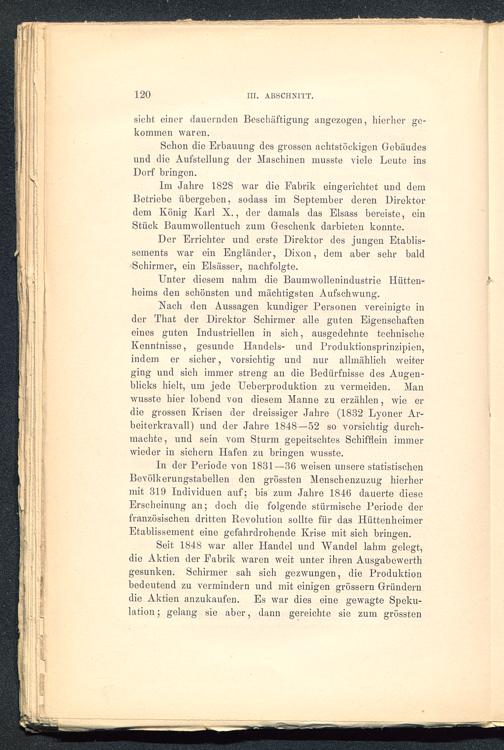 Im Jahre 1828 war die Fabrik eingerichtet und demBetriebe übergeben, sodass im September deren Direktordem König Karl X. , der damals das Eisass bereiste, einStück Baumwollentuch zum Geschenk darbieten konnte.