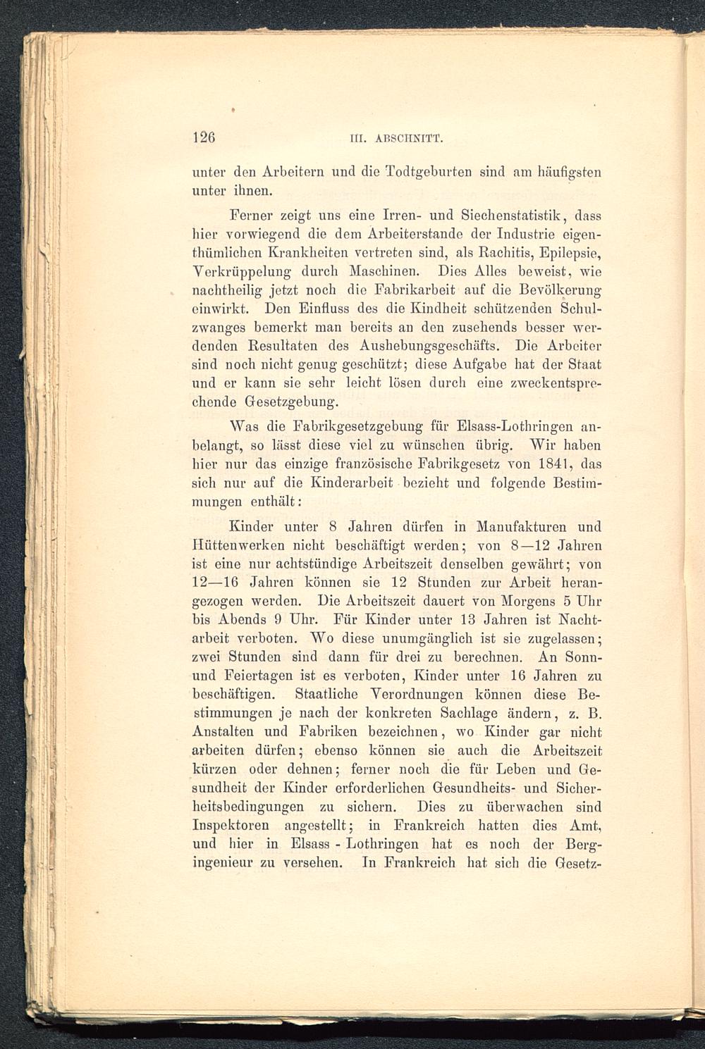 Was die Fabrikgesetzgebung für Elsass-Lothringen an-belangt, so lässt diese viel zu wünschen übrig. Wir habenhier nur das einzige französische Fabrikgesetz von 1841, dassich nur auf die Kinderarbeit bezieht und folgende Bestim-mungen enthält :