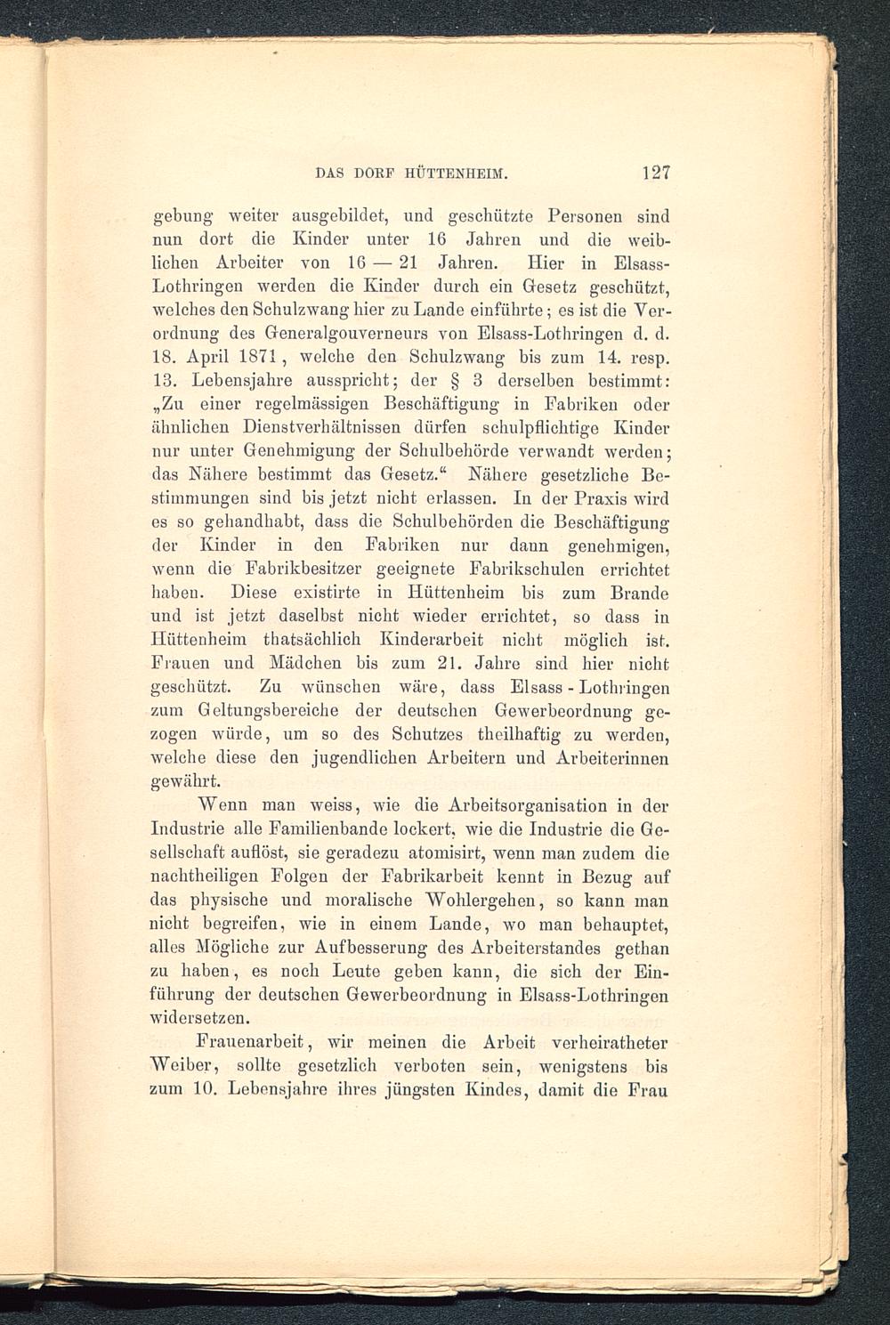 gebung weiter ausgebildet, und geschützte Personen sindnun dort die Kinder unter 16 Jahren und die weib-lichen Arbeiter von 16 — 21 Jahren. Hier in Eisass-Lothringen werden die Kinder durch ein Gesetz geschützt,welches den Schulzwang hier zu Lande einführte; es ist die Ver-ordnung des Generalgouverneurs von Elsass-Lothringen d. d.18. April 1871 , welche den Schulzwang bis zum 14. resp.13. Lebensjahre ausspricht; der § 3 derselben bestimmt:„Zu einer regelmässigen Beschäftigung in Fabriken oderähnlichen Dienstverhältnissen dürfen schulpflichtige Kindernur unter Genehmigung der Schulbehörde verwandt werden;das Nähere bestimmt das Gesetz.“ Nähere gesetzliche Be-stimmungen sind bis jetzt nicht erlassen. Iu der Praxis wirdes so gehandhabt, dass die Schulbehörden die Beschäftigungder Kinder in den Fabriken nur dann genehmigen,wenn die Fabrikbesitzer geeignete Fabrikschulen errichtethaben. Diese existirte in Hüttenheim bis zum Brandeund ist jetzt daselbst nicht wieder errichtet, so dass inHüttenheim thatsächlich Kinderarbeit nicht möglich ist.Flauen und Mädchen bis zum 21. Jahre sind hier nichtgeschützt. Zu wünschen wäre, dass Elsass-Lothringenzum Geltungsbereiche der deutschen Gewerbeordnung ge-zogen würde, um so des Schutzes theilhaftig zu werden,welche diese den jugendlichen Arbeitern und Arbeiterinnengewährt.