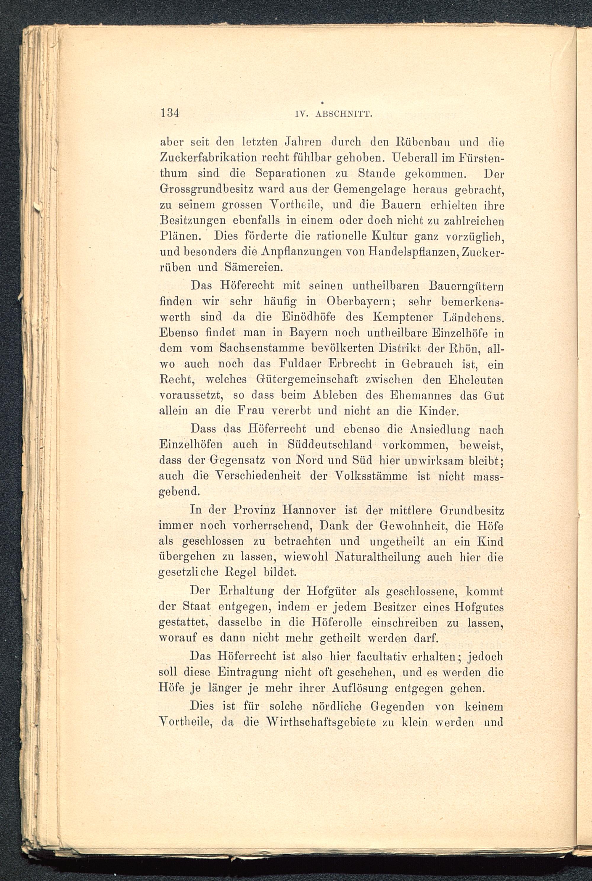 Das Höferecht mit seinen untheilbaren Bauerngüternfinden wir sehr häufig in Oberbayern ; sehr bemerkens-werth sind da die Einödhöfe des Kemptener Ländchens.Ebenso findet man in Bayern noch untheilbare Einzelhöfe indem vom Sachsenstamme bevölkerten Distrikt der Rhön , all-wo auch noch das Fuldaer Erbrecht in Gebrauch ist, einRecht, welches Gütergemeinschaft zwischen den Eheleutenvoraussetzt, so dass beim Ableben des Ehemannes das Gutallein an die Frau vererbt und nicht an die Kinder.