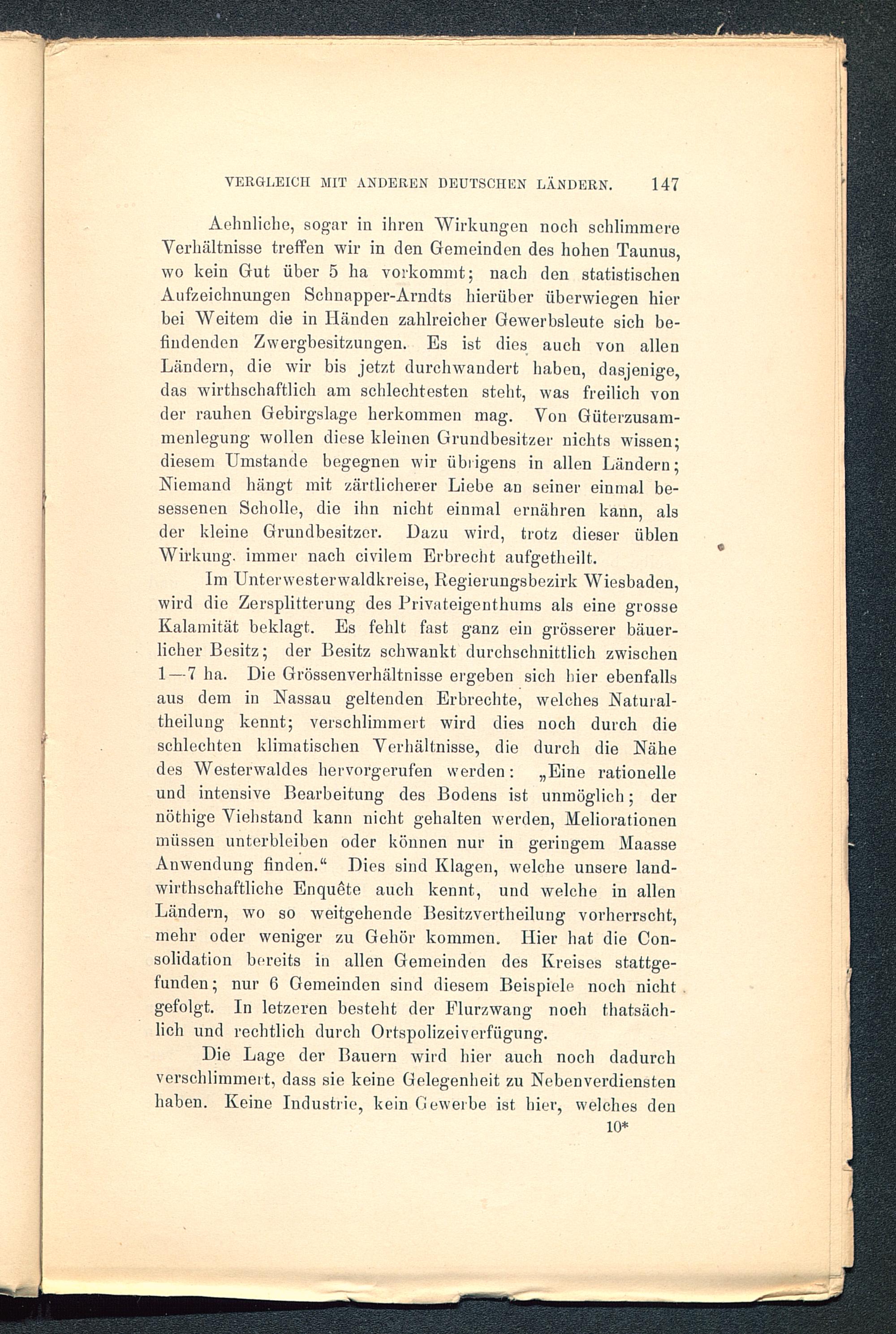 Im Unterwesterwaldkreise, Regierungsbezirk Wiesbaden,wird die Zersplitterung des Privateigentums als eine grosseKalamität beklagt. Es fehlt fast ganz ein grösserer bäuer-licher Besitz; der Besitz schwankt durchschnittlich zwischen1 — 7 ha. Die Grössenverhältnisse ergeben sich hier ebenfallsaus dem in Nassau geltenden Erbrechte, welches Natural-theilung kennt; verschlimmert wird dies noch durch dieschlechten klimatischen Verhältnisse, die durch die Nähedes Westerwaldes hervorgerufen werden: „Eine rationelle