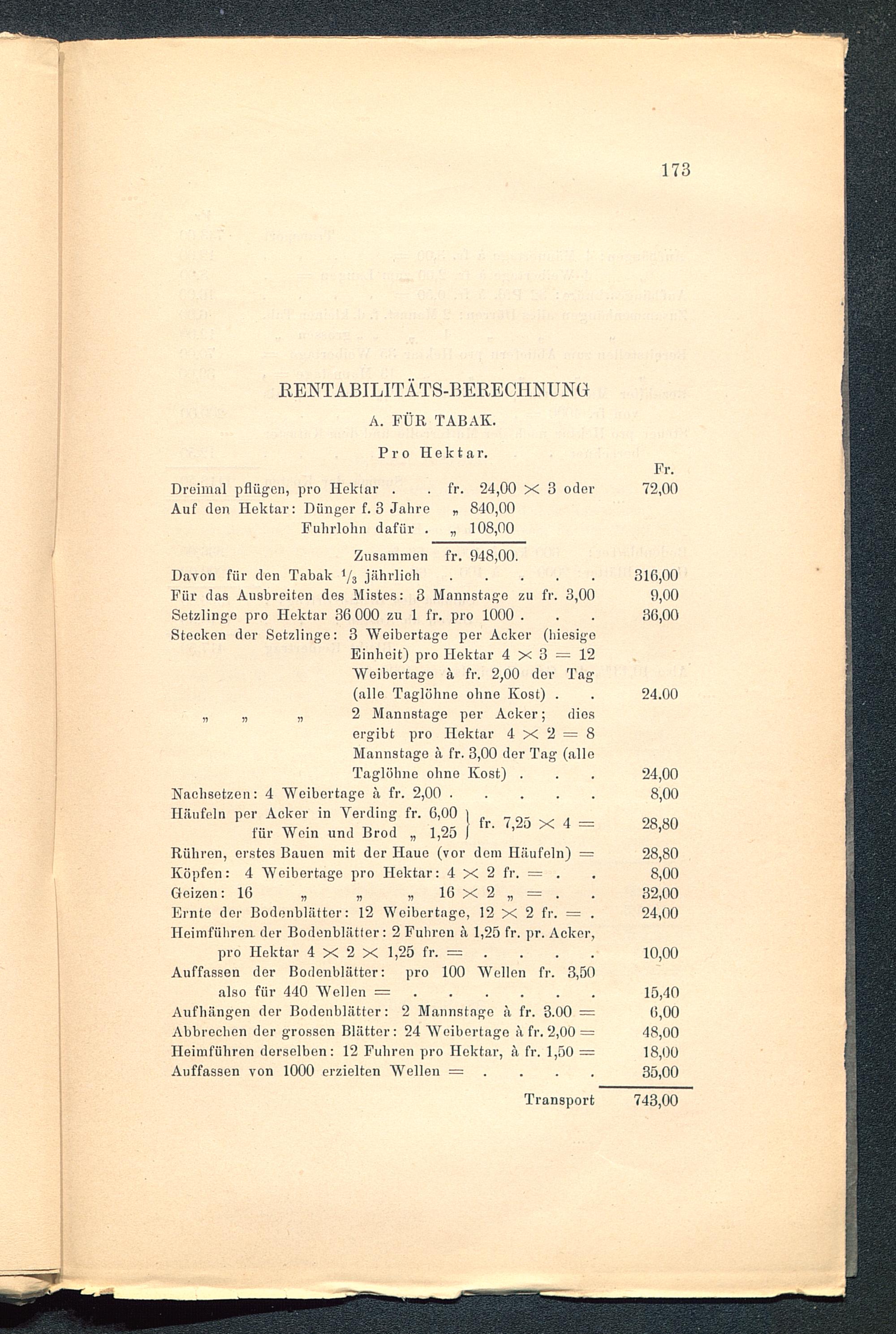 Ernte der Bodenblätter: 12 Weibertage, 12 X 2 fr. = .Heimführen der Bodenblätter: 2 Fuhren ä 1,25 fr. pr. Acker,pro Hektar 4 X 2 X 1,25 fr. =