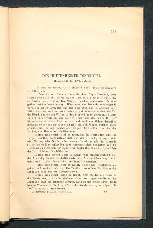 2 Item man spricht auch zu recht, das die Dorffleuthe, oder dieBurger desselben dorfs nützsch nidt von der Almende, es seyen holtzoder Matten, oder Weide, oder welcher handt es sein das almendesollent sie wedder verkauffen noch versetzen, ohne des hoffes und derHeren willen desselben Hoves, und würde darüber üt verkauft, so hörteder Dritt Pfening den hoffen zu.