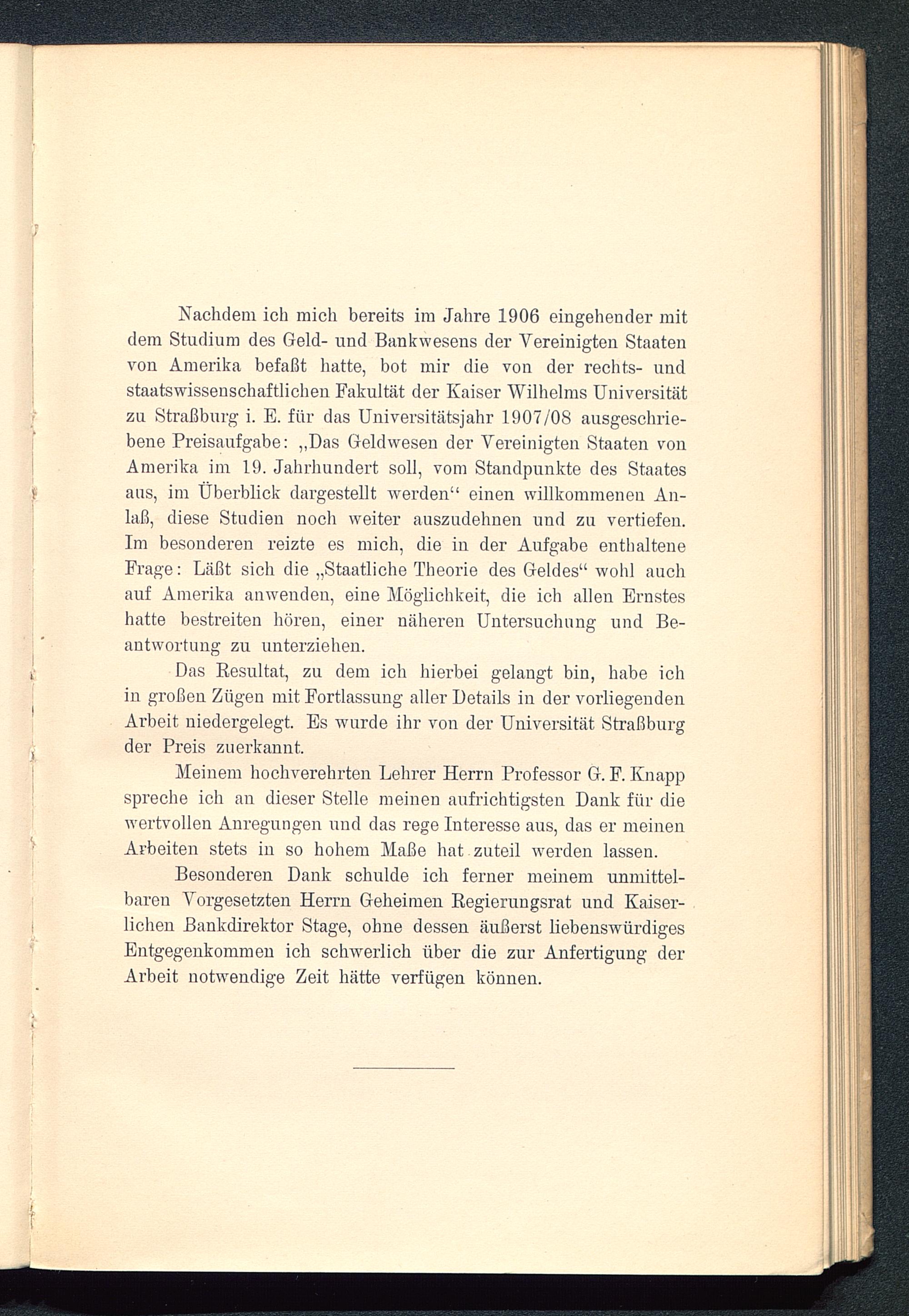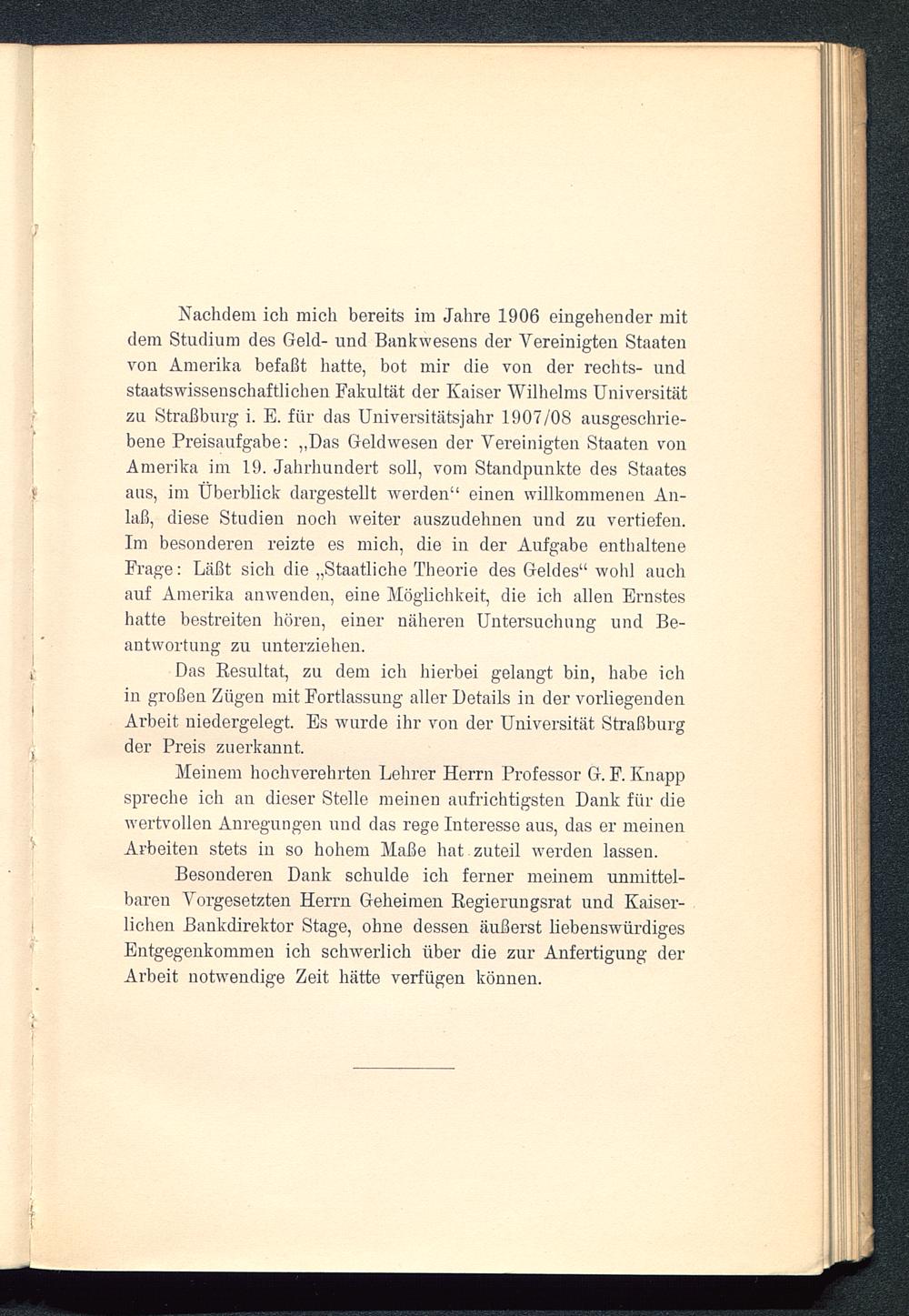 Nachdem ich mich bereits im Jahre 1906 eingehender mitdem Studium des Geld- und Bankwesens der Vereinigten Staaten von Amerika befaßt hatte, bot mir die von der rechts- undstaatswissenschaftlichen Fakultät der Kaiser Wilhelms Universitätzu Straßburg i. E. für das Universitätsjahr 1907/08 ausgeschrie-bene Preisaufgabe: „Das Geldwesen der Vereinigten Staaten vonAmerika im 19. Jahrhundert soll, vom Standpunkte des Staatesaus, im Überblick dargestellt -werden“ einen willkommenen An-laß, diese Studien noch weiter auszudehnen und zu vertiefen.Im besonderen reizte es mich, die in der Aufgabe enthalteneFrage: Läßt sich die „Staatliche Theorie des Geldes“ wohl auchauf Amerika anwenden, eine Möglichkeit, die ich allen Ernsteshatte bestreiten hören, einer näheren Untersuchung und Be-antwortung zu unterziehen.